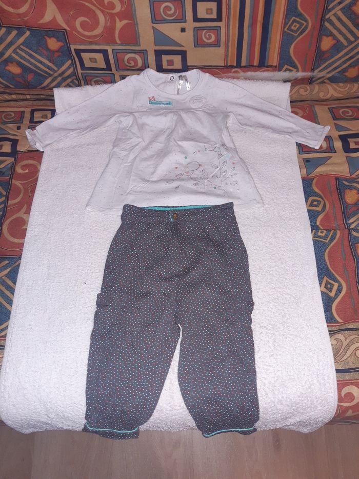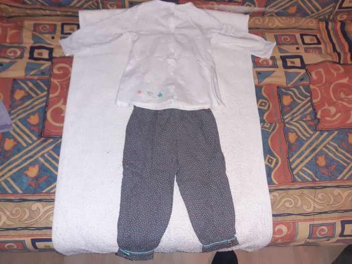 Bon état, léger. Pantalon 96 % coton, 4 % elasthanne Haut avec 5 boutons pressoirs dans le dos. 84 % coton 11 % polyestère 5 % elasthanne. N'hésitez pas à regarder mes autres ventes, je peux faire 10 % de réduction sur chaque article acheté.