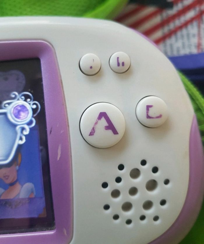 Vend console avec traces d'usures mais fonctionne très bien. Les écritures sont un peu effacé mais ne dérange pas. Vendu avec 1 caméra photo, 1 jeu de princesse et sa pochette de rangement. #jouetjennycdu76
