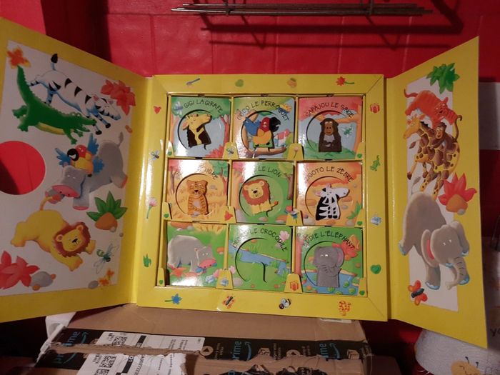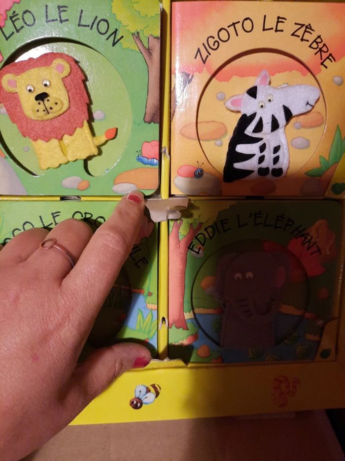Coffret livres marionnettes ⚠️ il manque 1 livre et 1 marionnette (crocodile) Le coffret est satisfaisant mais les livres en très bon état #livreenfantjennycdu76