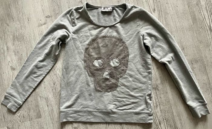 Sweat fin de la marque K.woman de Kiabi Motif crâne Taille XS Dimension largeur aux épaules 32 cm, largeur à la poitrine 42 cm, longueur 54 cm Petites traces d’utilisation Occasion, bon état