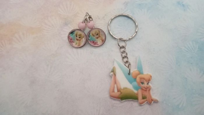 Lot fée Clochette, une paire de boucle d'oreille et un porte clé En très bon état, jamais porté #handmade #bouclesdoreilles #earrings #porteclés #keychain #keyring #clochette #feeclochette #disney
