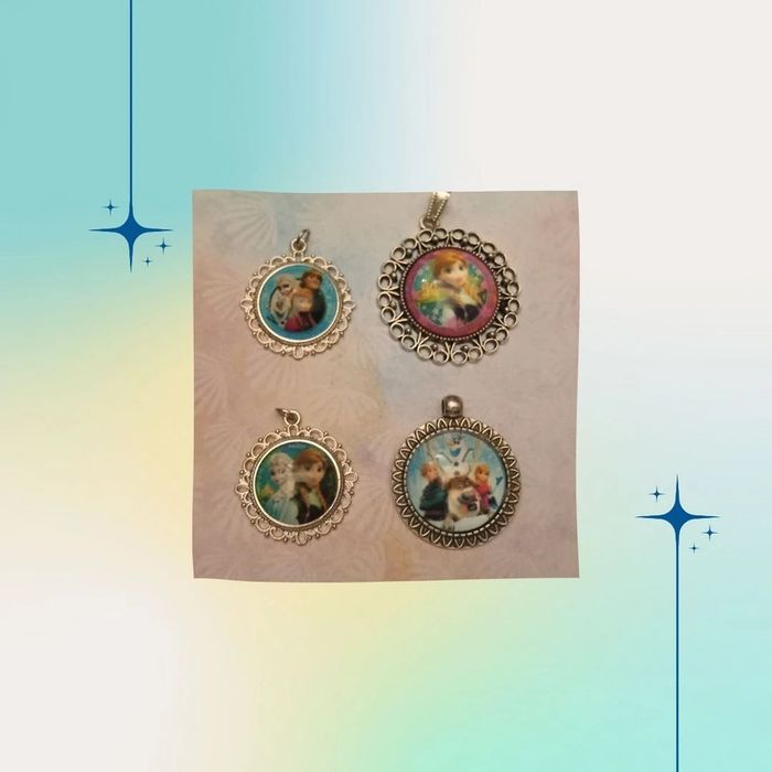 Lot 4 colliers La reine des neiges, vendu à bas prix parce qu'ils ont un défaut image légèrement flou mais on voit les personnages Jamais porté #necklace #collier #frozen #lareinedesneiges #elsa #anna #olaf #sven #jewelry #bijoux #disney #enfant #adulte #love #cute
