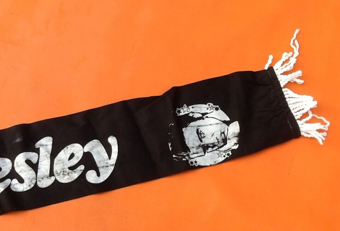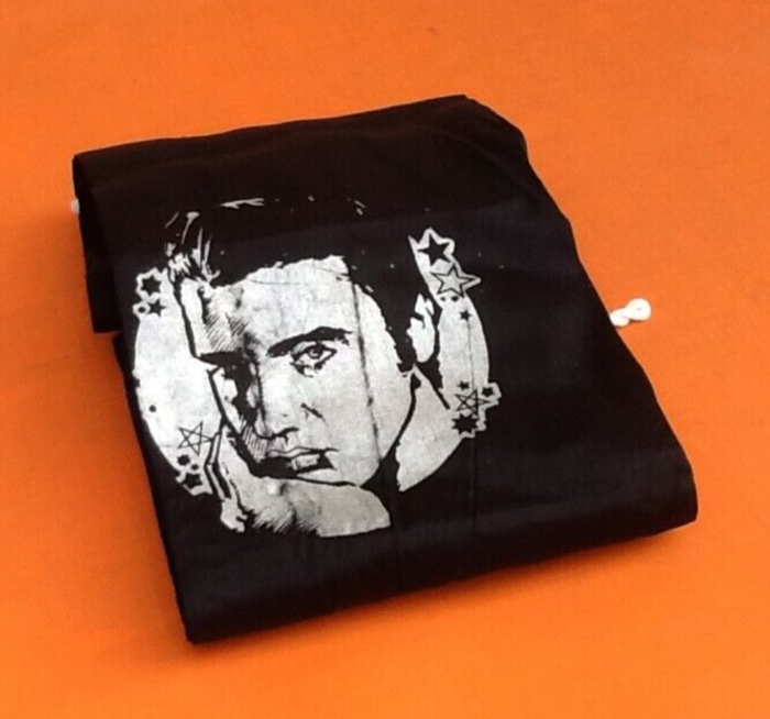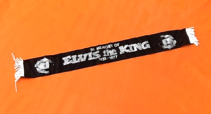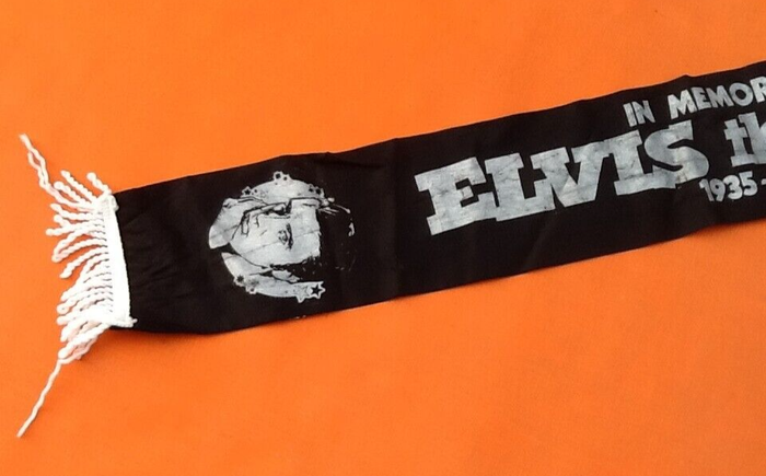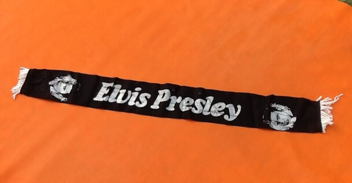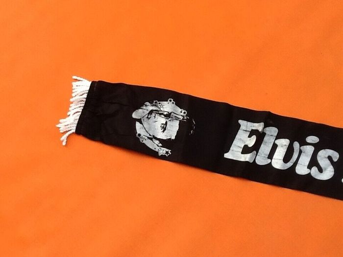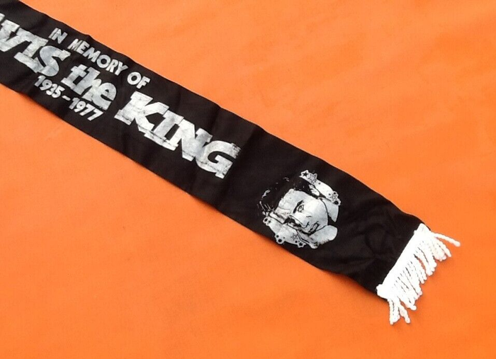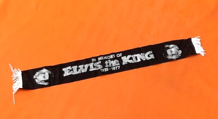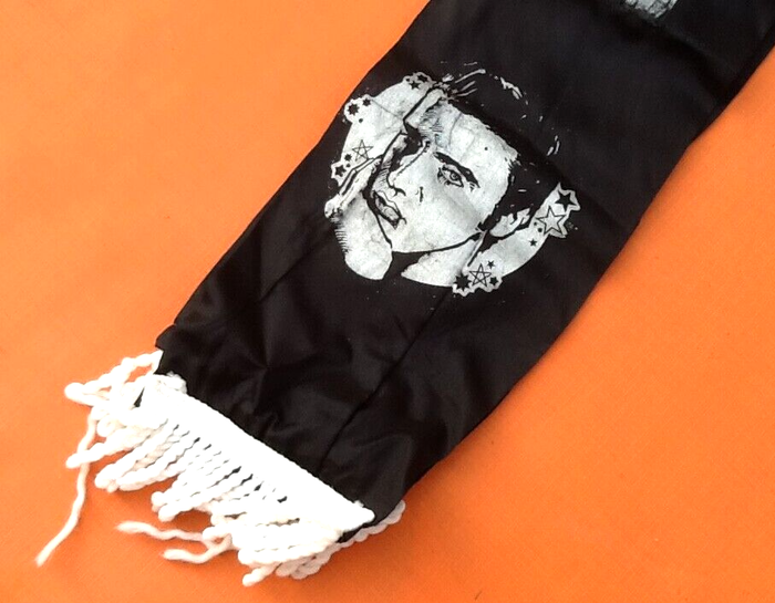 (article vendu en l' état, état d'usage, photo 2 petits accrocs, voir toutes les photos) Echarpe à franges collector Elvis Presley Recto In Memory of Elvis the King 1935-1977 Verso Elvis Presley Longueur : 1150mm Largeur 130mm Poids : 40grs