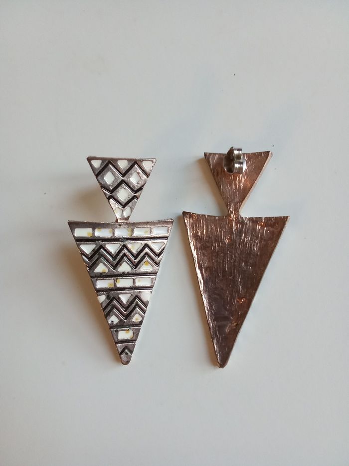 Fantaisie, pendante couleur doré blanc motif triangle, assez lourdes. Beaucoup d'autres paires disponibles ds mon dressing et réduction activée