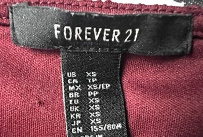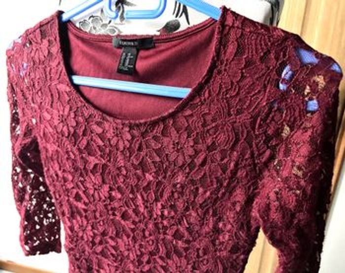 Marque "Forever 21". Corps dentelle doublée, manches 3/4 non doublées, Matière extensible : dentelle 92% polyamide, 8% élasthanne, doublure 100% polyester. Tour de poitrine 84 cm, tour de taille 66 cm, longueur 82 cm.