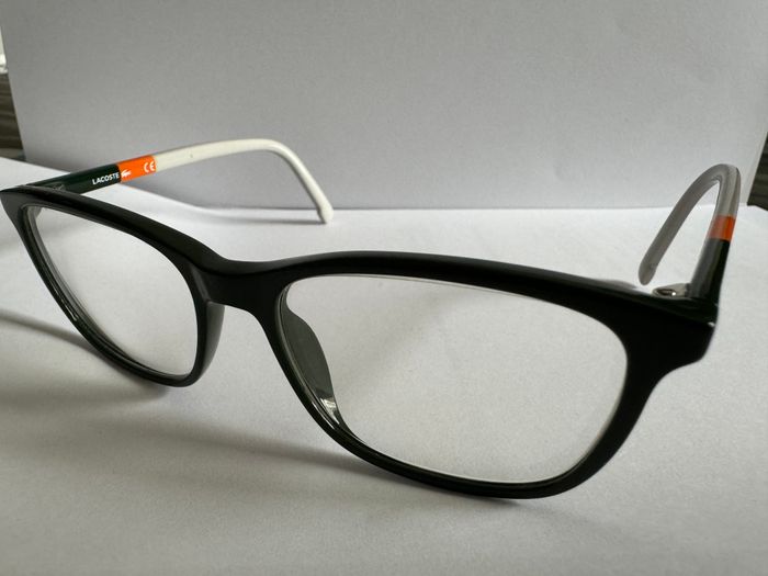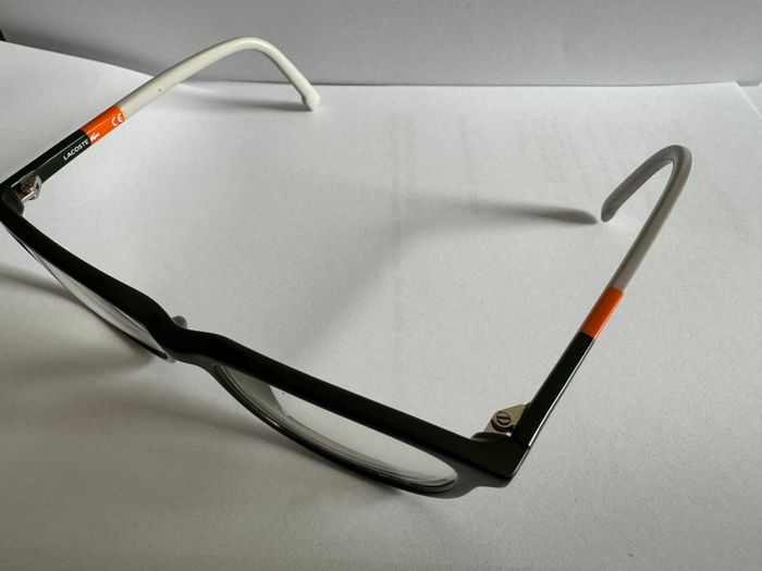 Monture de lunette de vue Lacoste pour enfant. Taille : Garçon de 6 à 9 ans Couleur : Verte foncée, orange et blanche En très bon état Fournies avec une housse souple.