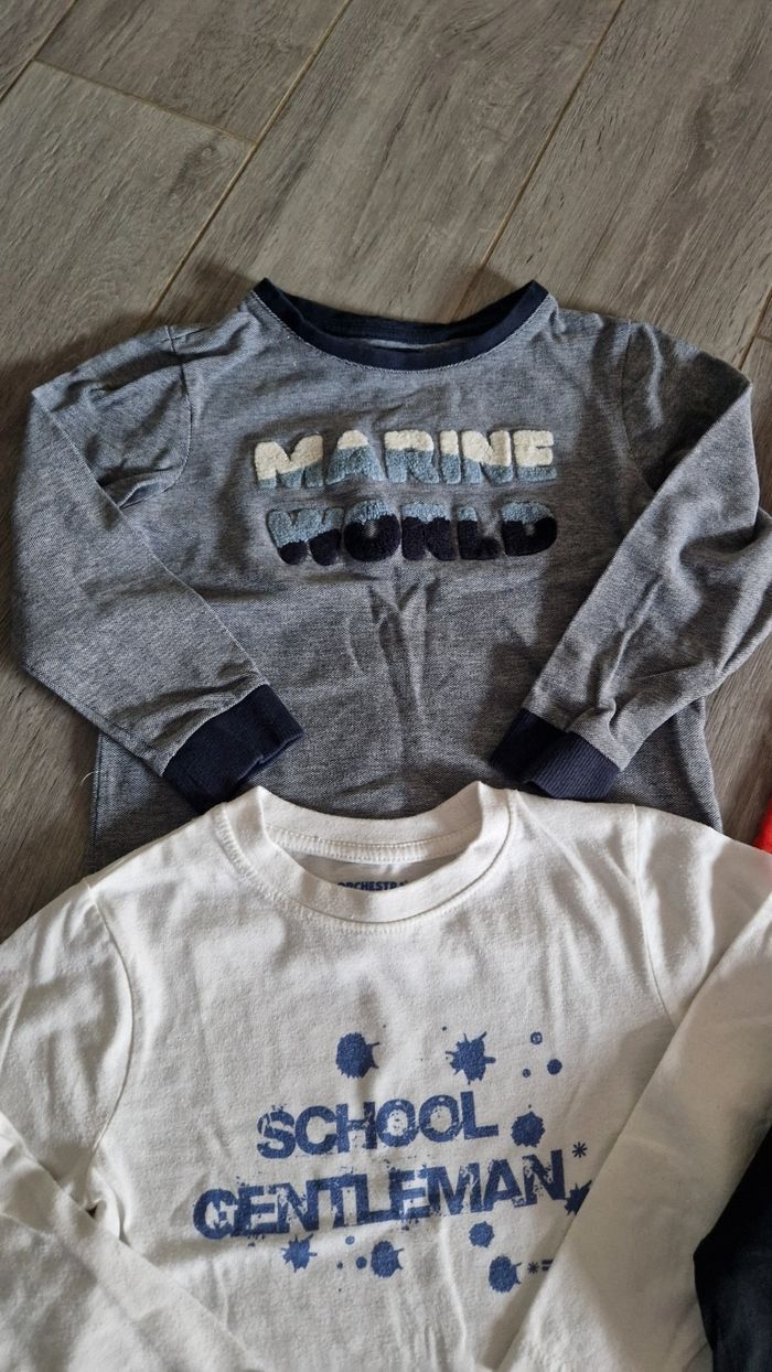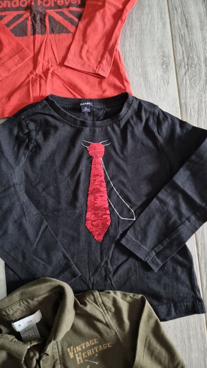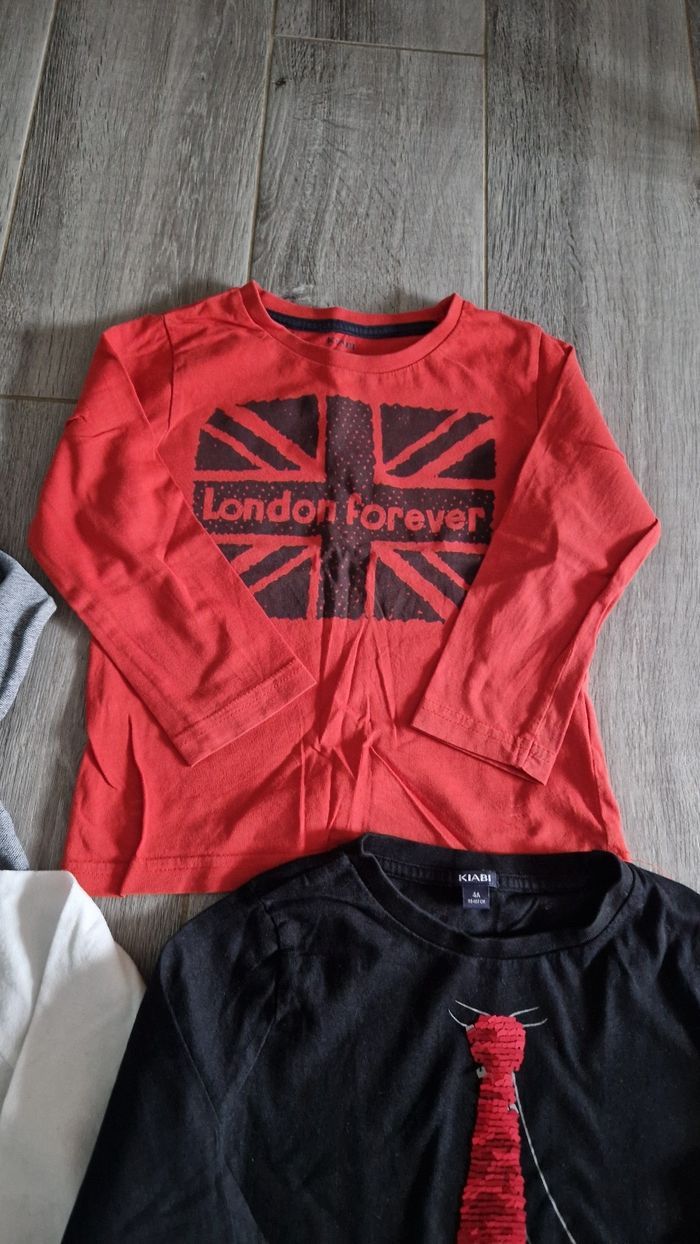 Lot de 4 tee-shirt manches longues + 1 polo. taille 4 ans. 1 polo, noté 6 ans, mais taille petit. Marque orchestra, la redoute, kiabi. Très bon état.