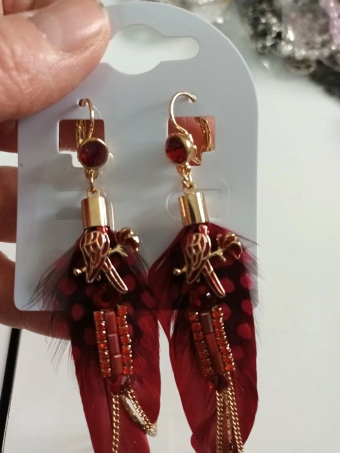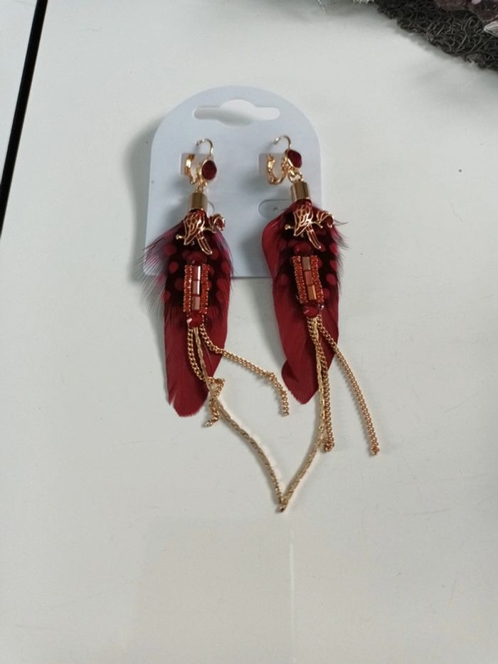 Boucle fantaisie bohème neuve rouge et doré avec plume