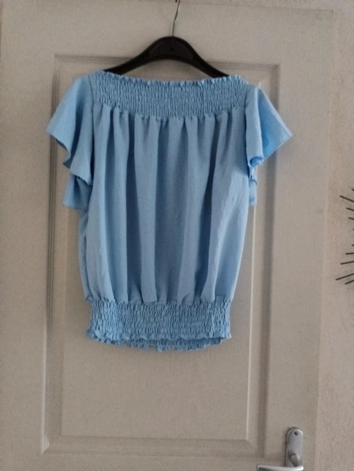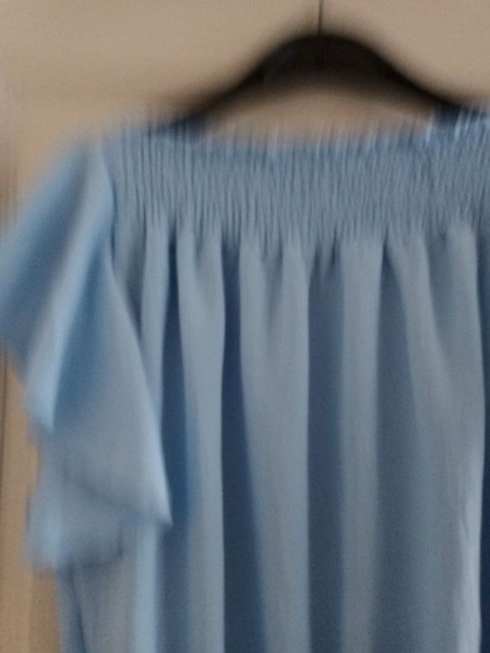 Blouse bleu ciel jamais portée possibilité de mettre niveau épaule. Élastique à la taille et sur les épaules