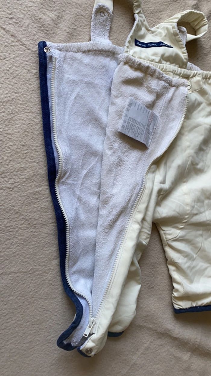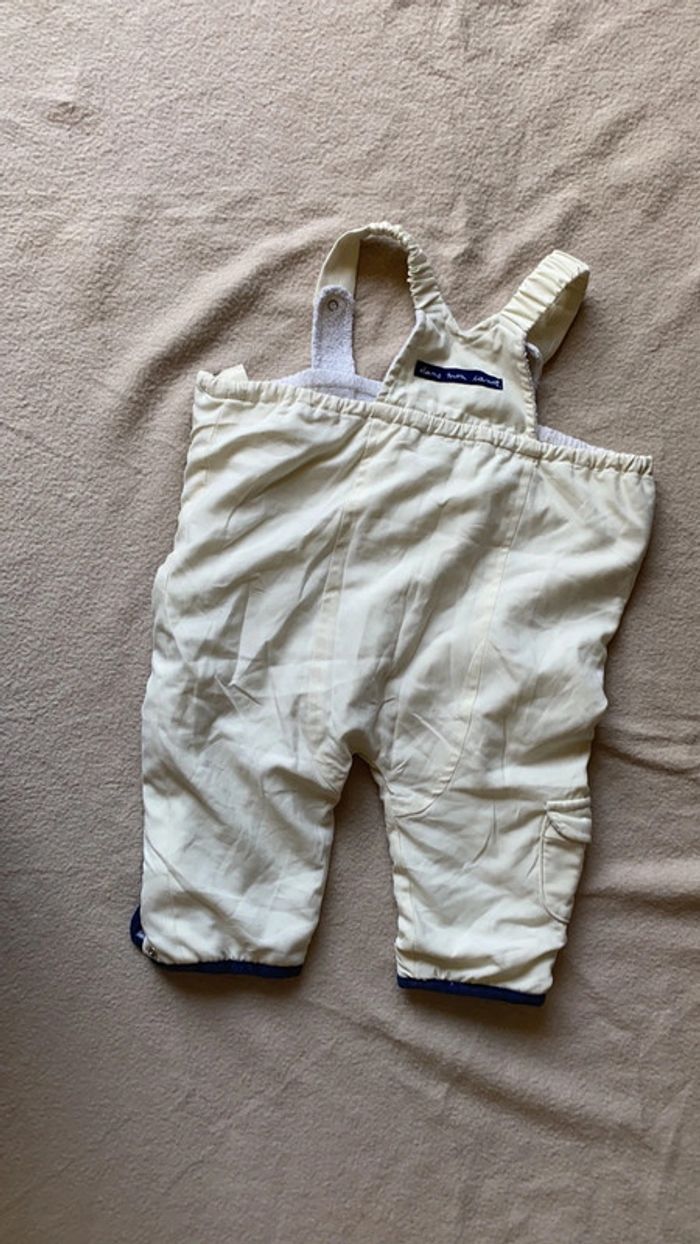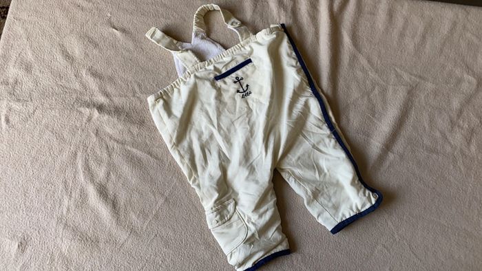 Salopette style comme les pêcheurs couleur crème et bande bleu s’ouvre sur les côtés voir photo3 Composition du vêtement voir photo4 Très bon état Taille 6mois
