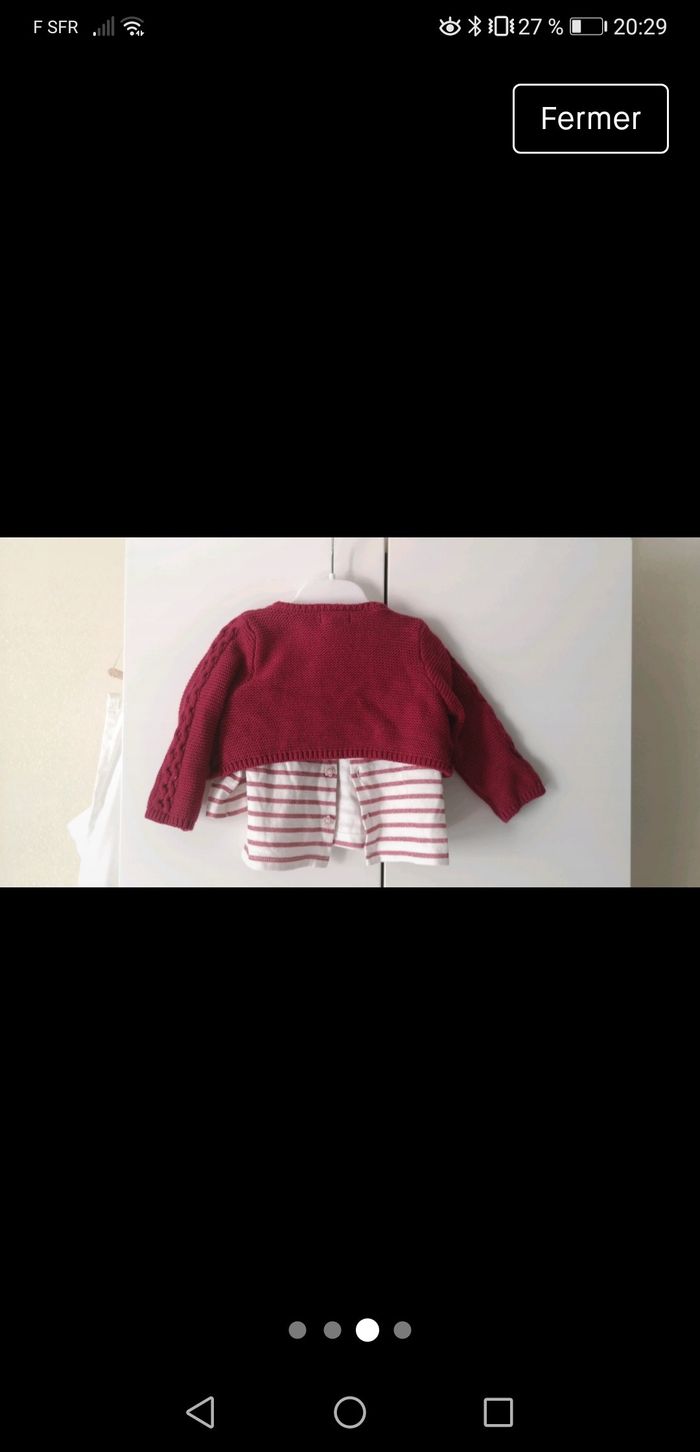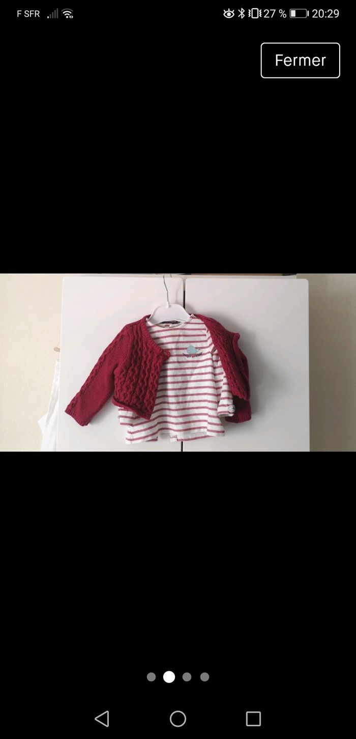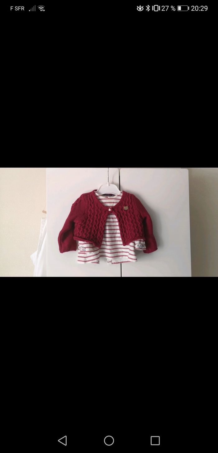 Je vend en lot / ensemble De la marque SERGENT MAJOR - 1 gilet / boléro rouge - 1 haut manche longue à rayure blanches et rouge et un petit motif baleine Taille 6 mois En excellent état.