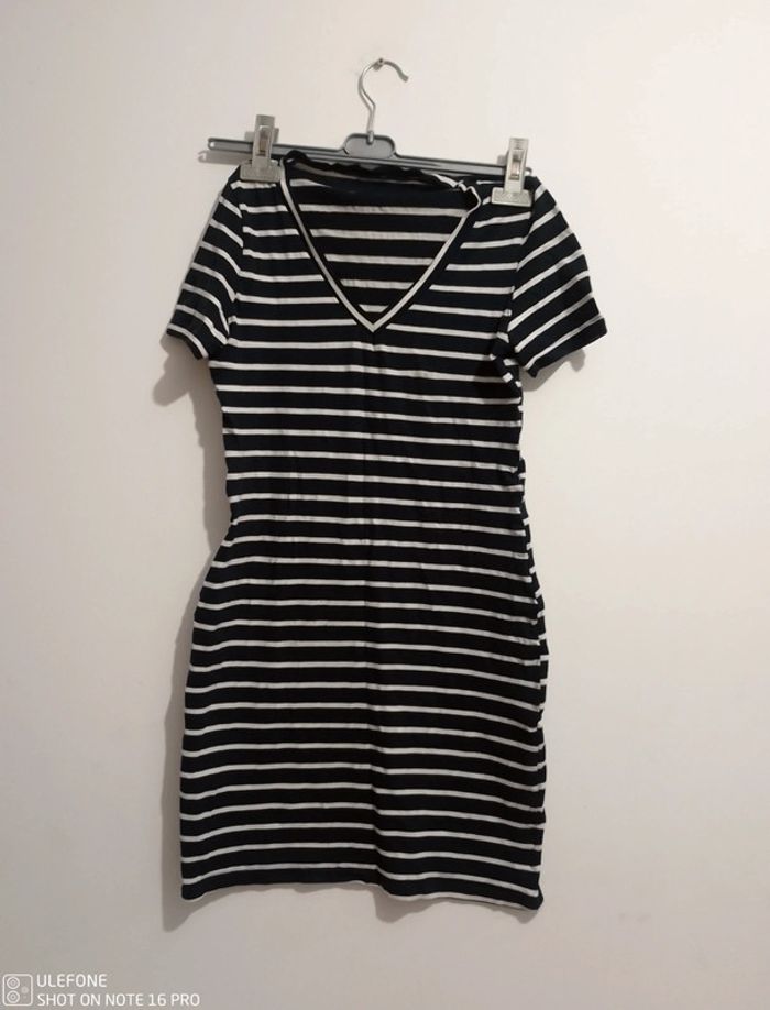 Belle robe rayée Attention elle est de couleur bleu marine/blanc, ne pas se fier à la photo qui donne noir et blanc. Légère tâche visible sur la partie haute de la robe ( voir photo) #lilia2988_taille36 Bon état Taille 36/38
