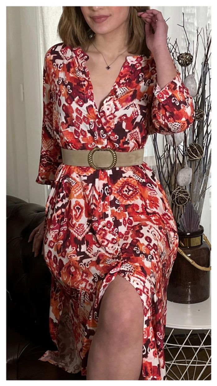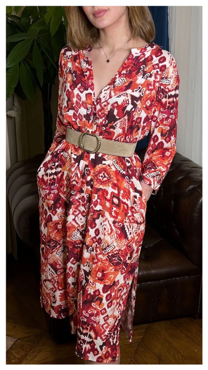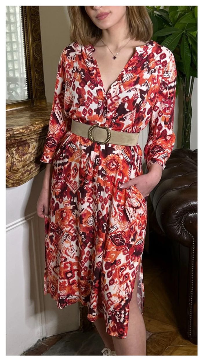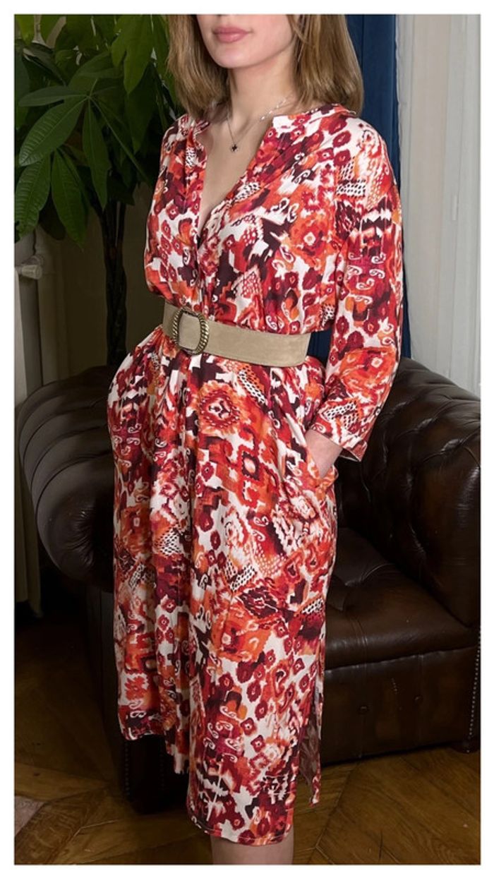 Fabrication française Taille 2 38/40 Composition 100% viscose Boutonnée sur toute la longueur Poches latérales Ceinture du même tissu Très légère et stylée