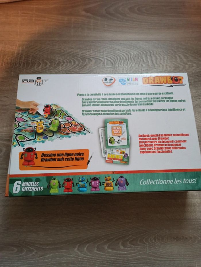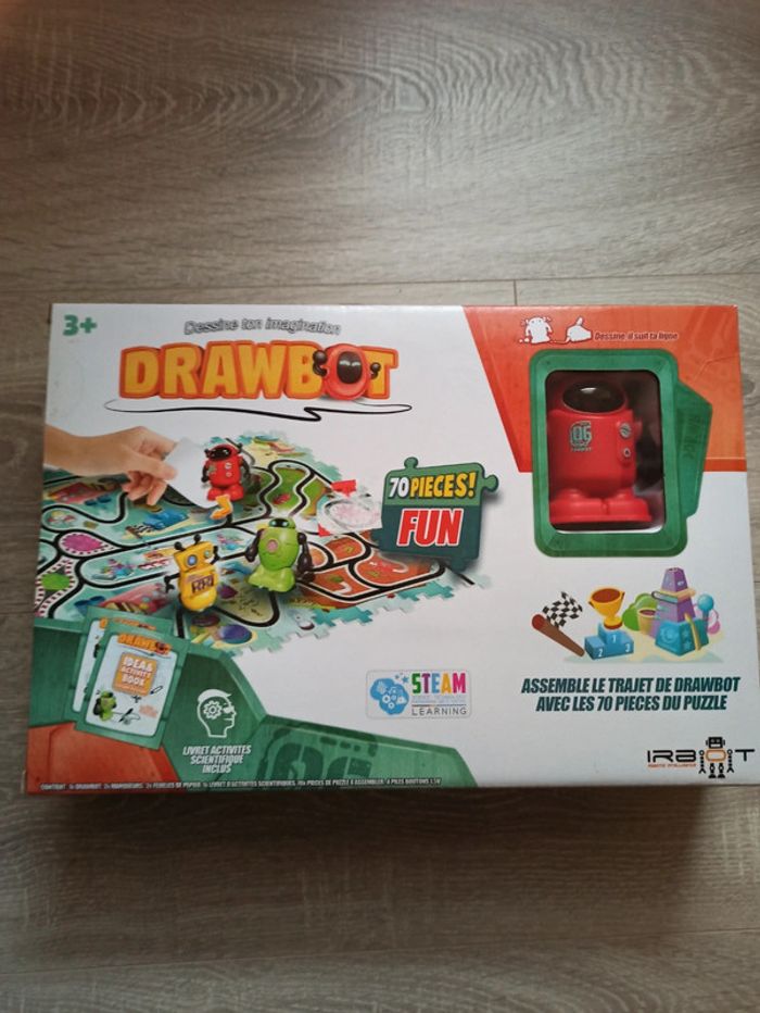 Pack contenant un DrawBot ainsi qu'un puzzle 70 pièces représentant un labyrinthe et l'univers des DrawBot - Pack de 70 ou 140 pièces contenant un robot qui suit les lignes noires dessinées ains i que des pièces de puzzles à assembler pour que le robot suive le parcours