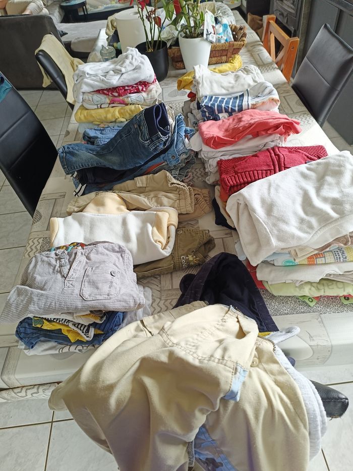 Vend gros lot de vêtements bébé 6 mois garçon qui comprend 18 pyjamas 13 t-shirts 5 chemises 5 shorts 1 survêtement 14 pantalons 10 pulls - vestes 48 bodys 1 gigoteuse 1 manteaux 1 salopette