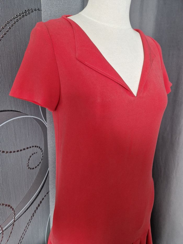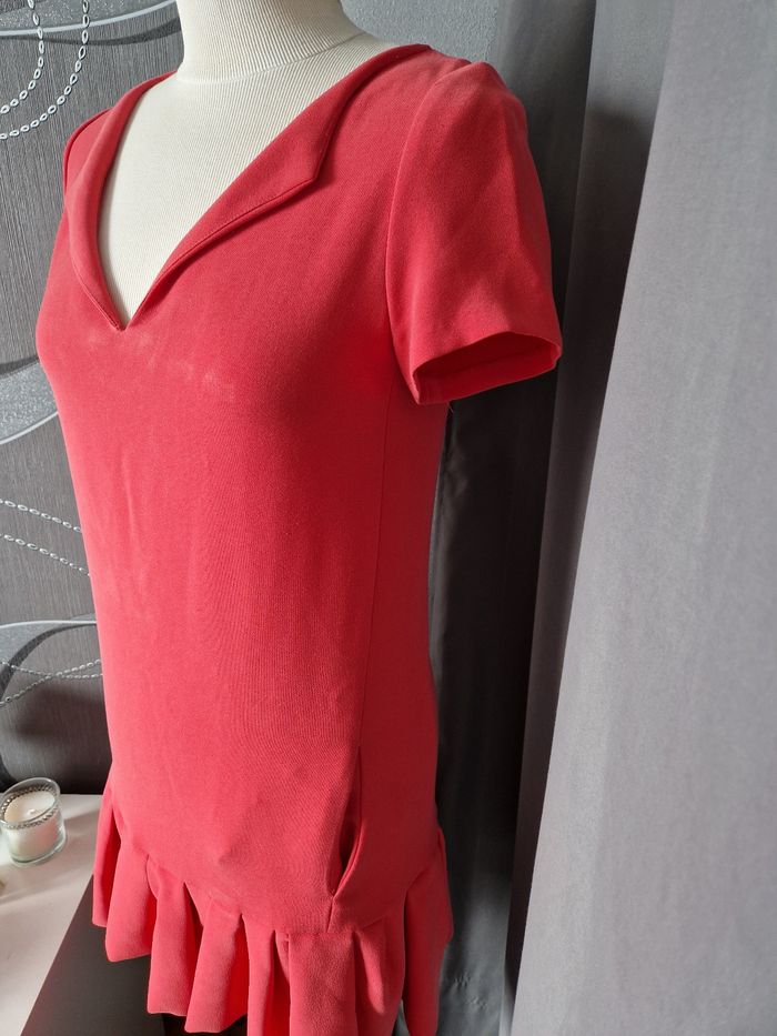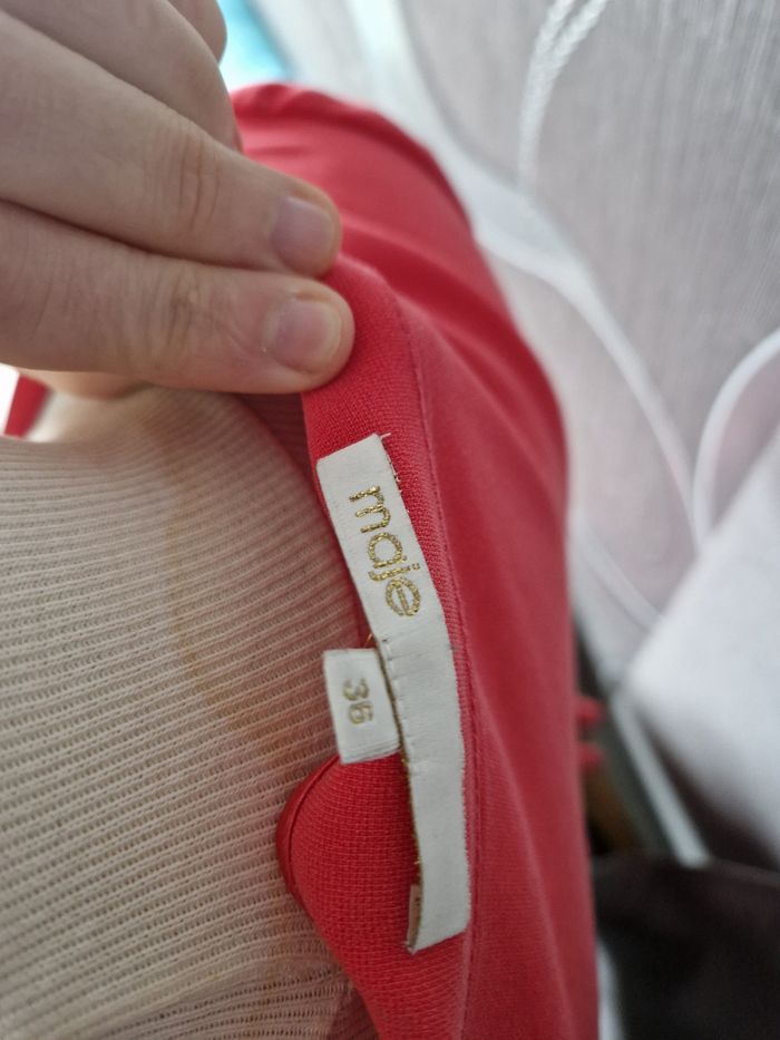 Robe Maje couleur corail en taille 36. Quelques imperfections ( légères marques de fer à repasser devant mais reste discret, sur l'arrière Quelques marques voir photo ? Mais reste en bon état, super qualité au niveau du tissu!