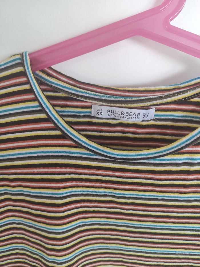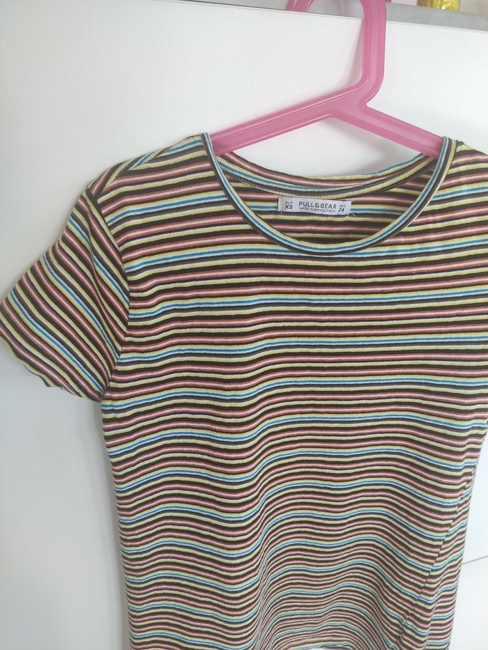 T-shirt très confortable car un peu extensible, rayé multicolore et manches courtes. Très bon état. Taille XS, acheté dans un magasin pull and bear. Peut convenir à une ado.