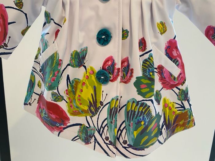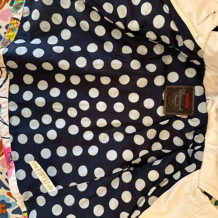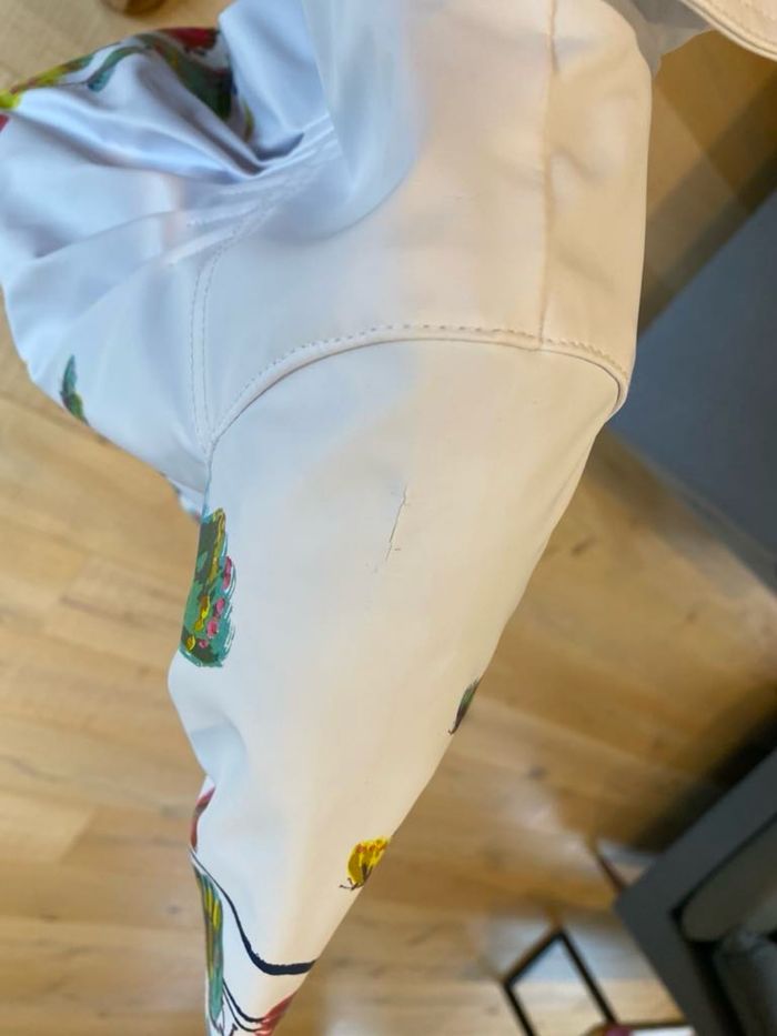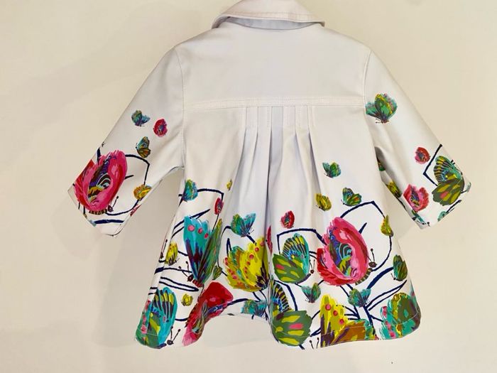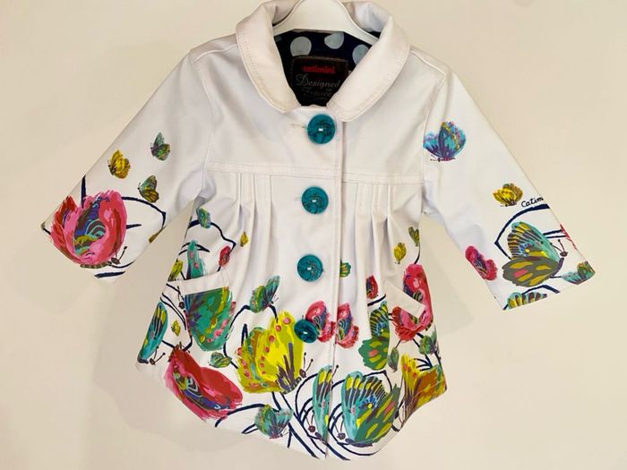 Manteau style imper Catimini en 6 mois Manteau qui a été rangé plié dans une caisse et ça a malheureusement fait un peu craquer la matière à certains endroits = cf photos Craquements visibles sur épaule et haut de manches mais pas troué ! Peut être mis encore 1 saison d’où la proposition à petit prix..