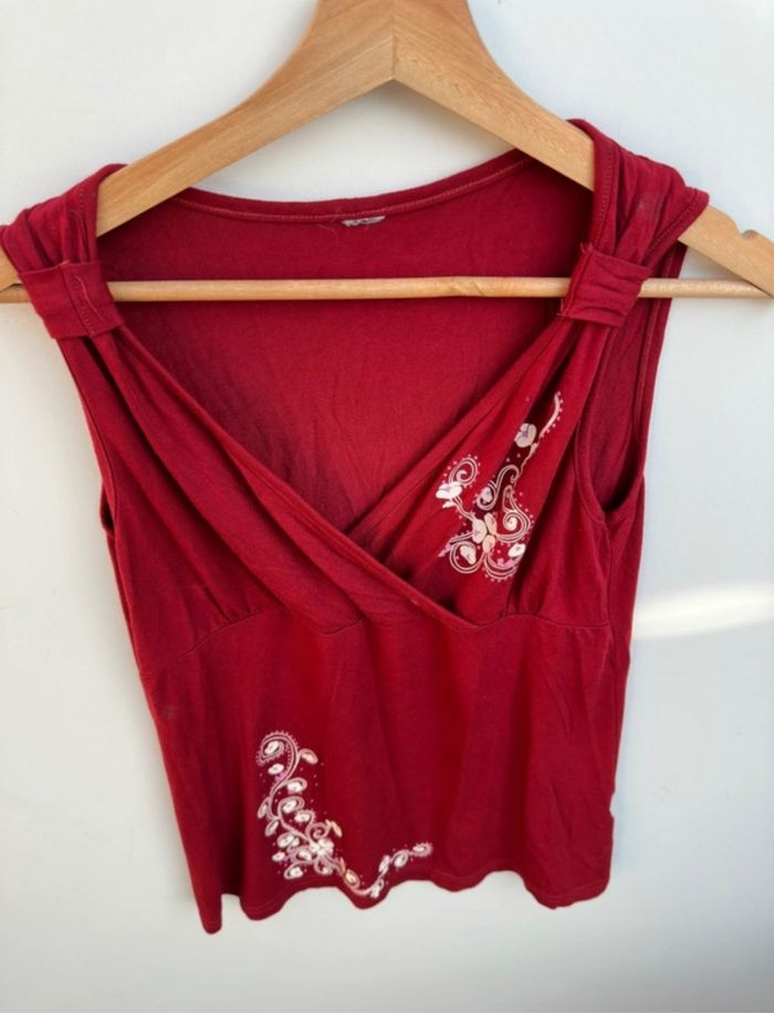 Haut sans manches Cache cœur Taille M Matière extensible Trace de fer a l’arrière (peu visible) Bon état général