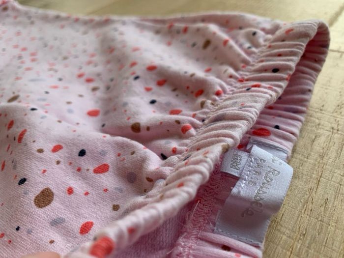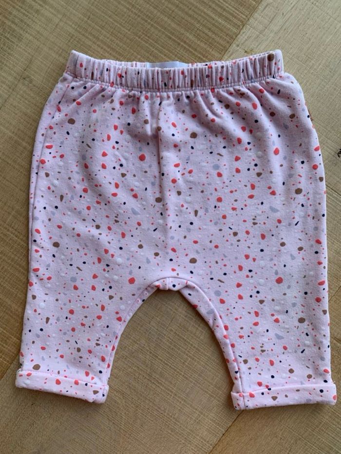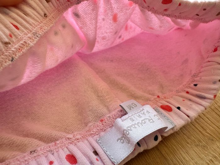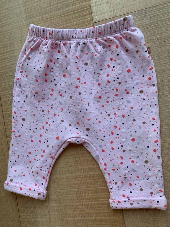 Cadet Rousselle en 6 mois Pantalon confortable (type sarouel pour s’adapter aux couches et permettent les mouvements) Molletonné - doux - effet un peu polaire à l’intérieur 95% coton 5% Elasthanne Rose pale avec motifs multicolores Parfait état