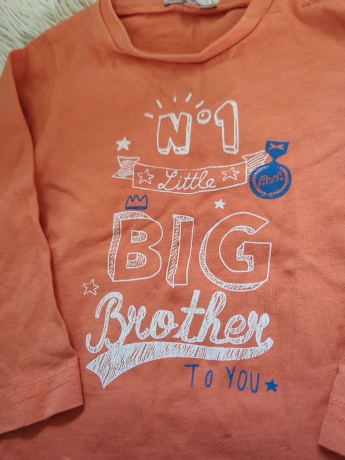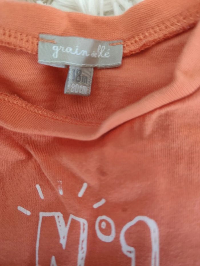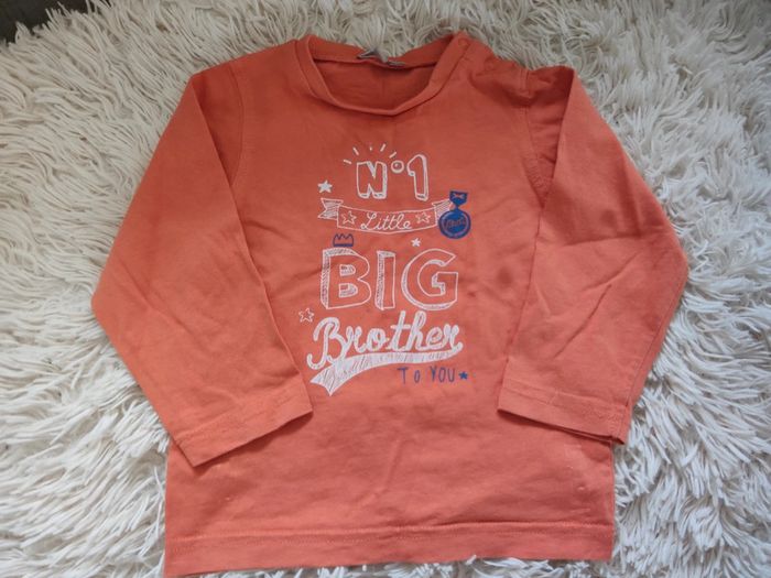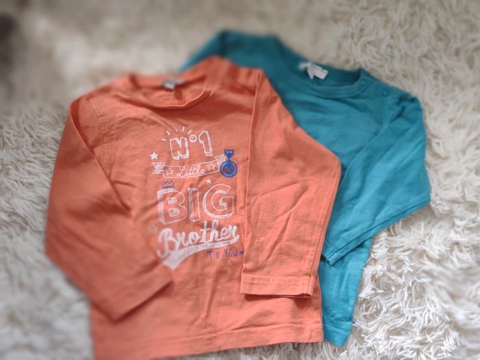 Lot de 2 t-shirts manches longues 18 mois Un orange Little Big brother peu porté, marque Grain de blé, en très bon état Un bleu uni, Kimbaloo, bon état Réduction sur les lots