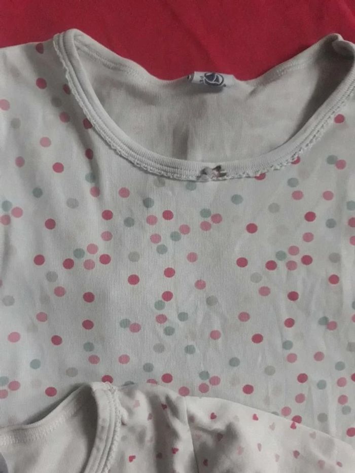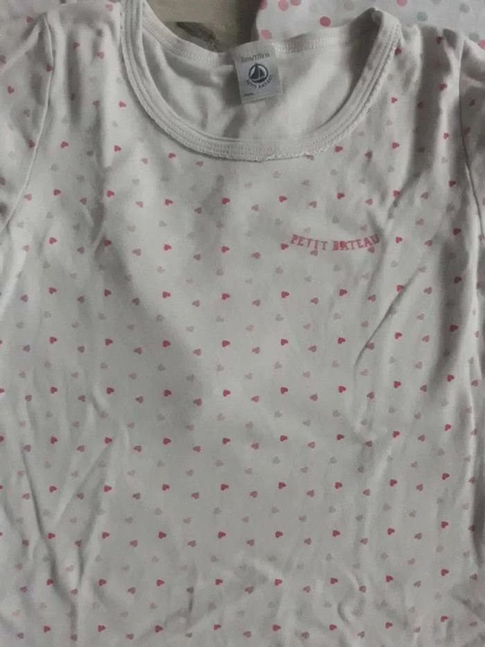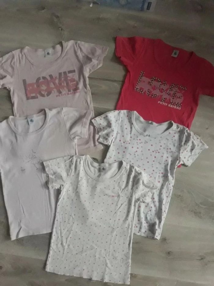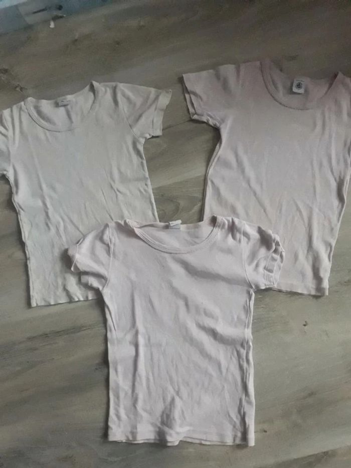Portés mais ils restent en très bon état pas de trous ni taches juste le dessin un peu craquelé sur le rose foncé. J offre les 3 tee-shirts petit bateau de la dernière photo qui peuvent encore servir mais ont une tâche..