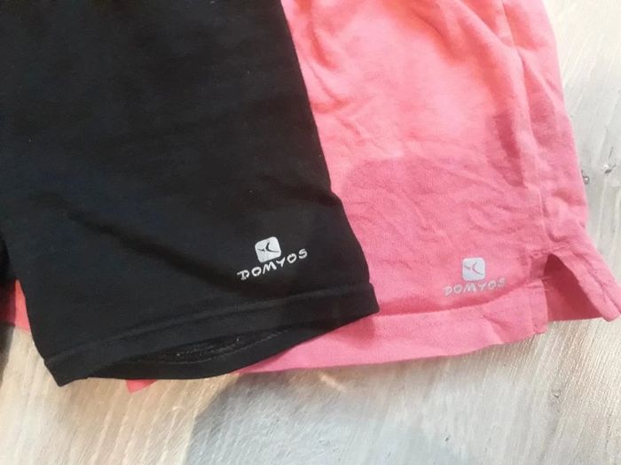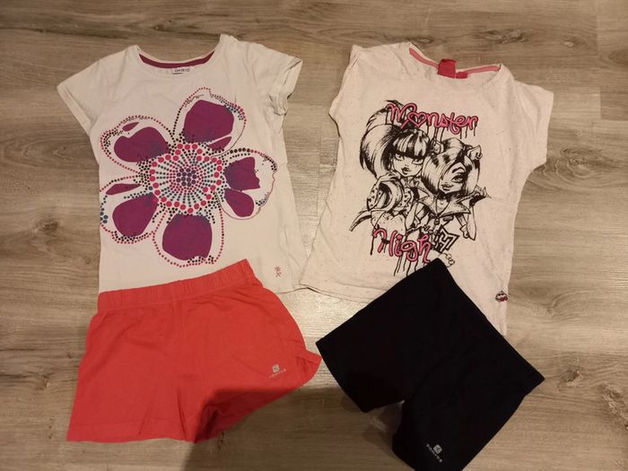 Shorts Domyos 6 ans mais taille grand(115/124cm) en très bon état Manque etiquette sur le rose + 2 tee-shirts 8 ans en bon état (pas de trou, ni tâche).