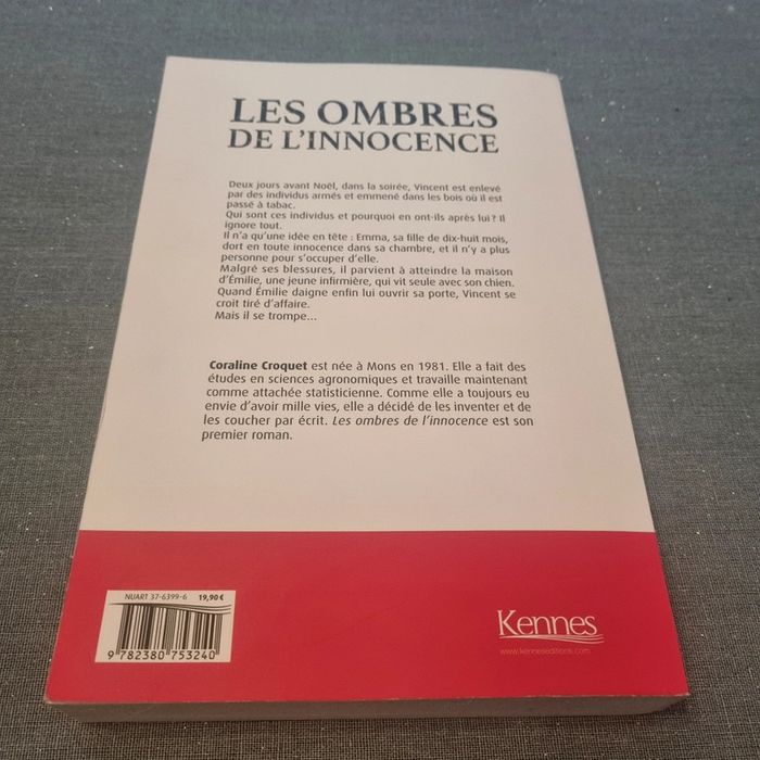 "Les ombres de l'innocence" de Coraline Croquet. Acheté neuf, lu une fois. Dédicacé par l'auteure à mon nom (voir dernière photo)