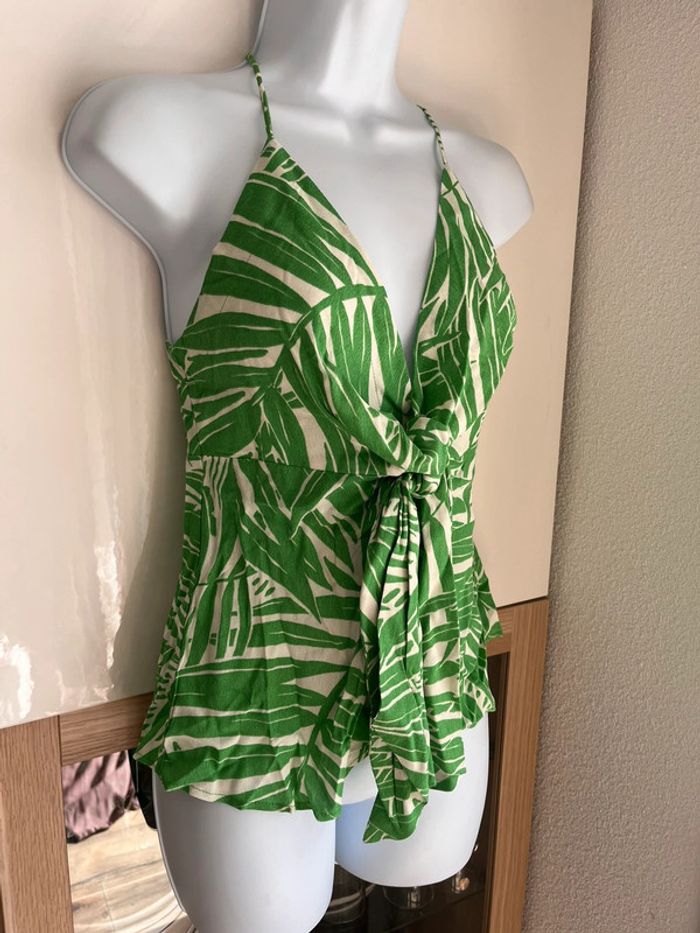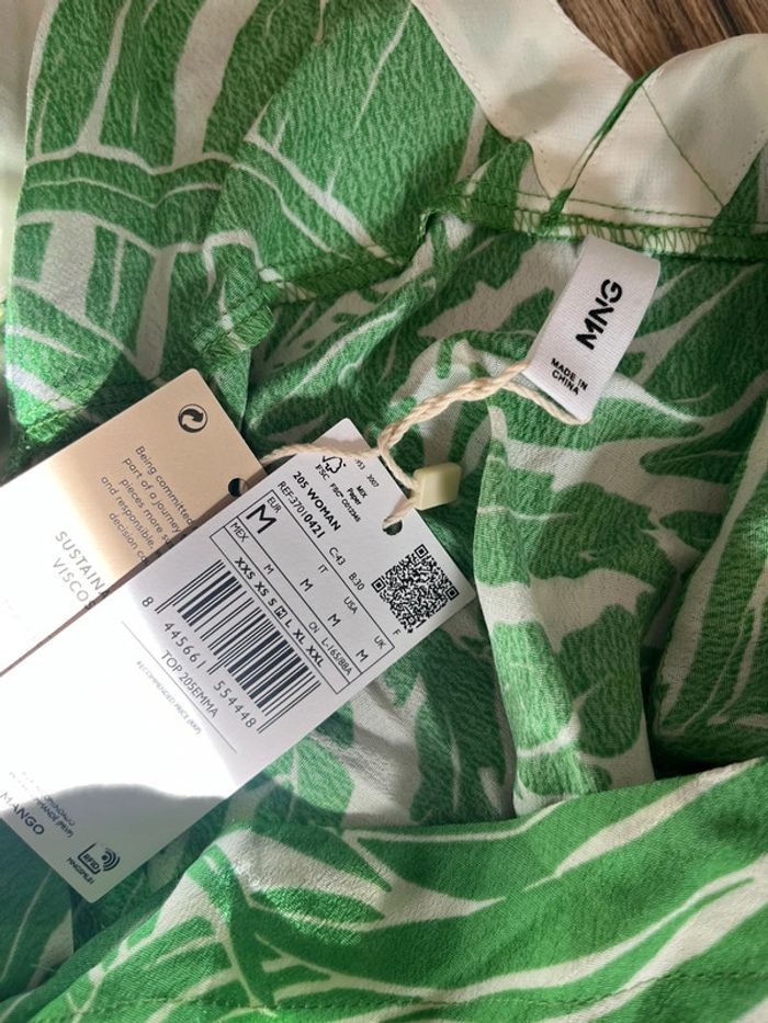 Motif feuilles vertes tropicales Détail noeud sous la poitrine Bretelle spaghettis Col V Mango neuf avec étiquette