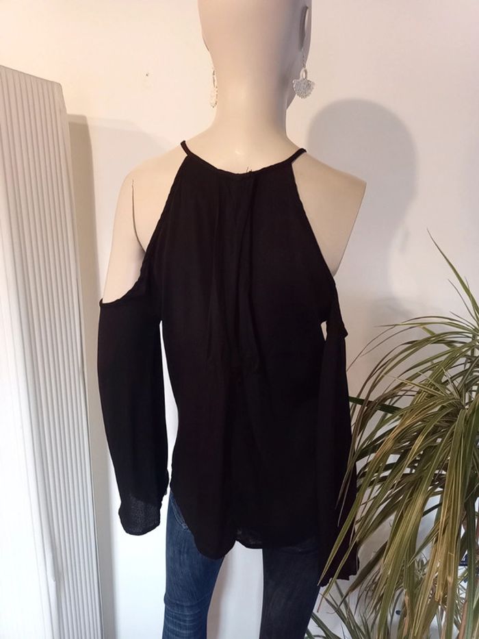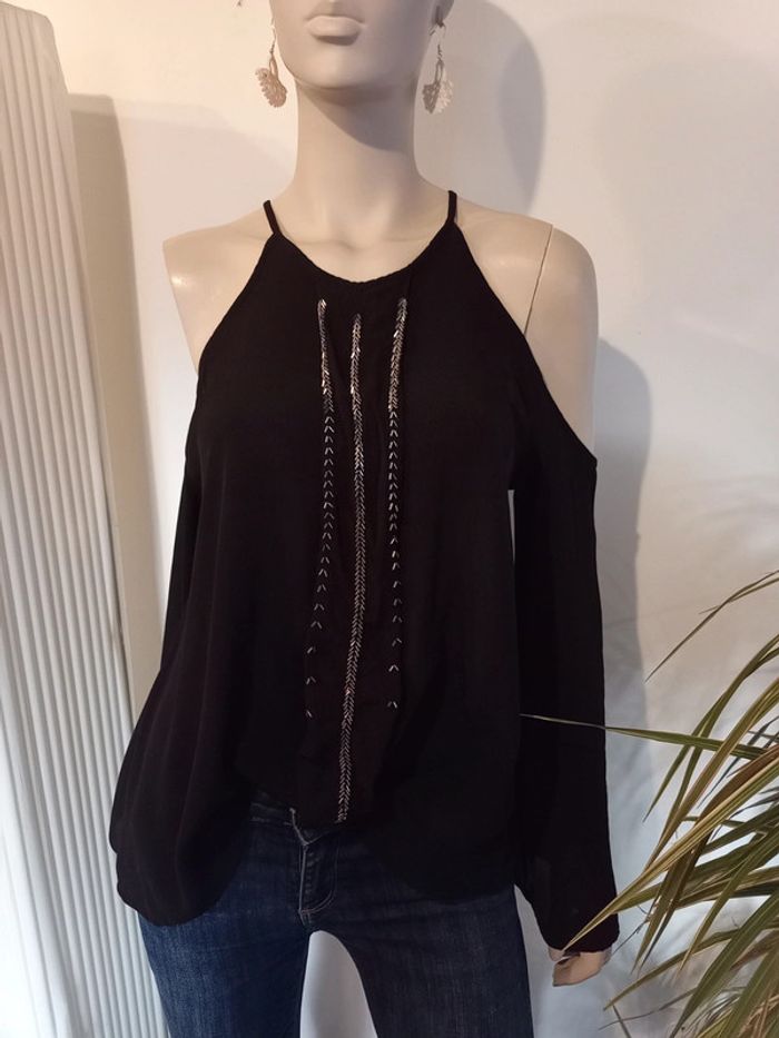 Manches longues Épaules dénudées Fermeture nuque par boutons pressions Perles argentées cousues sur le devant #autrementnay36