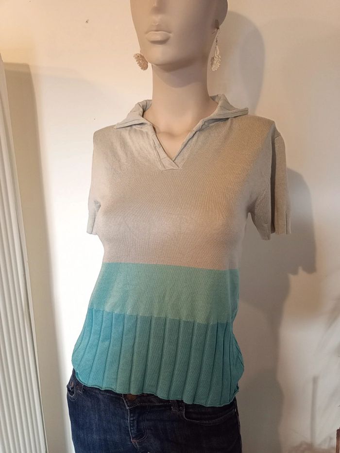 Dégradé du gris au bleu turquoise Manches courtes Reste en très bon état malgré les années Attention, je pense qu'il a été recousu a l'intérieur du col, voir derrière photo #autrementnay36