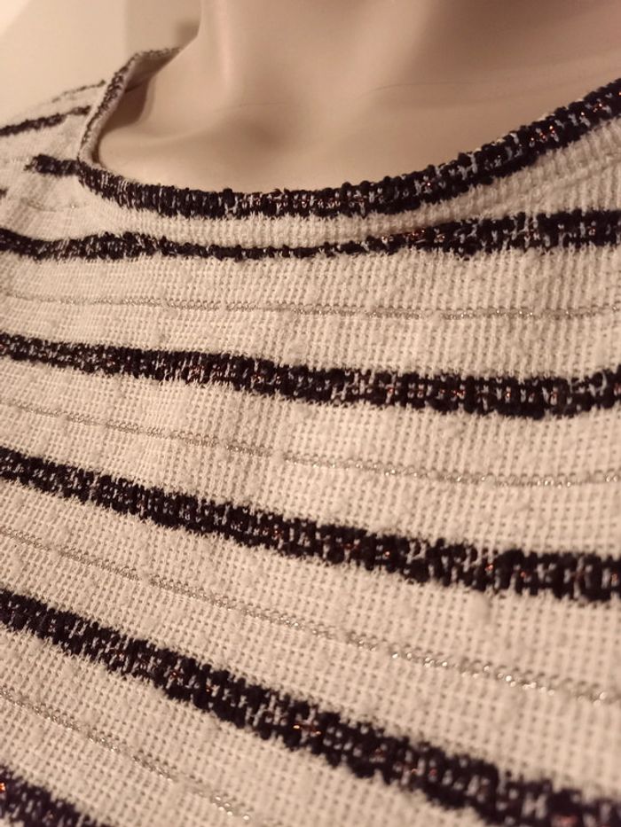 Assez fin Manches 3/4 Fil argenté et cuivré Comporte de petites bouloches Étiquette taille et composition coupée