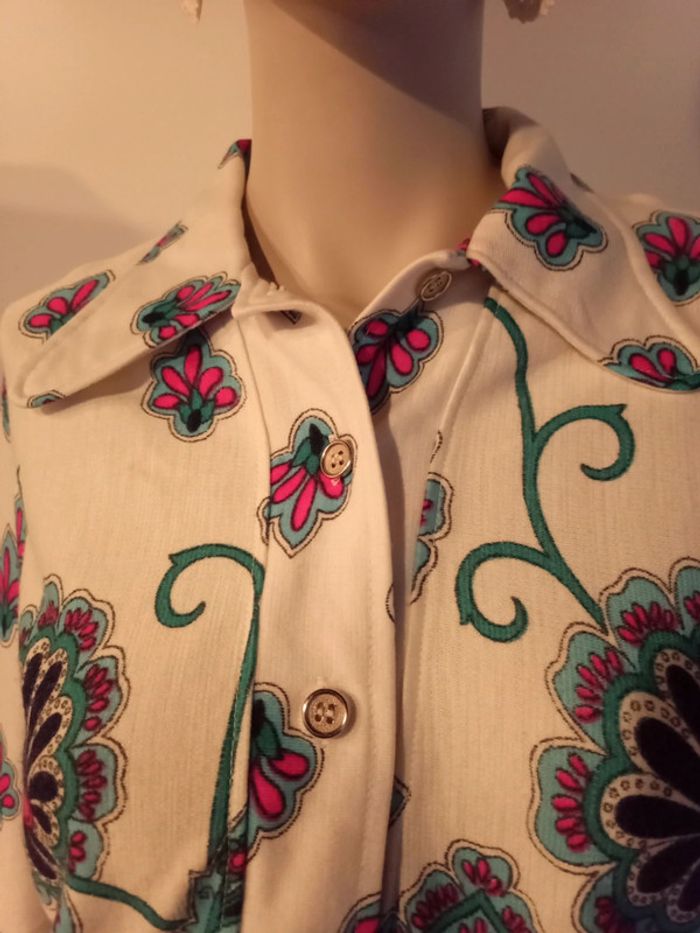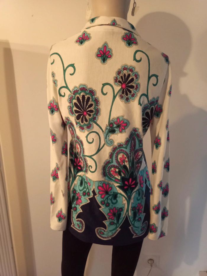 Coloré Manches longues Assez long. #autrementnay38 Boutons argentés jusqu'à poitrine Pas d'étiquette de marque et de taille Attention petite tâche, sur bas de manches, petit trou sur épaule ainsi que couture côté a revoir. voir dernières photo