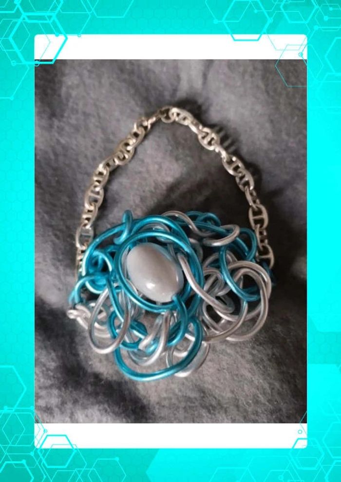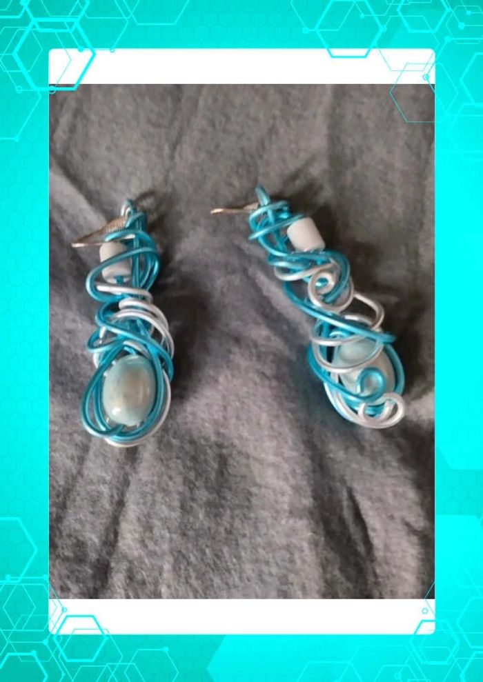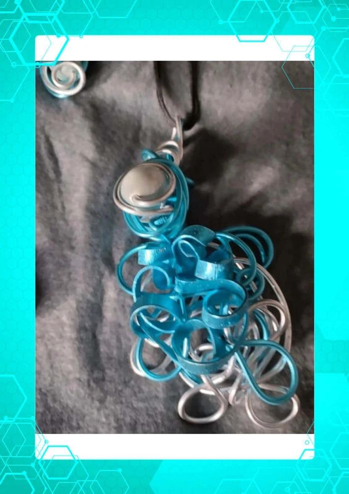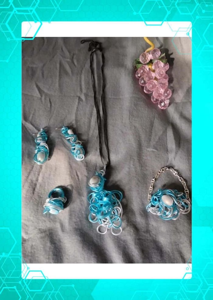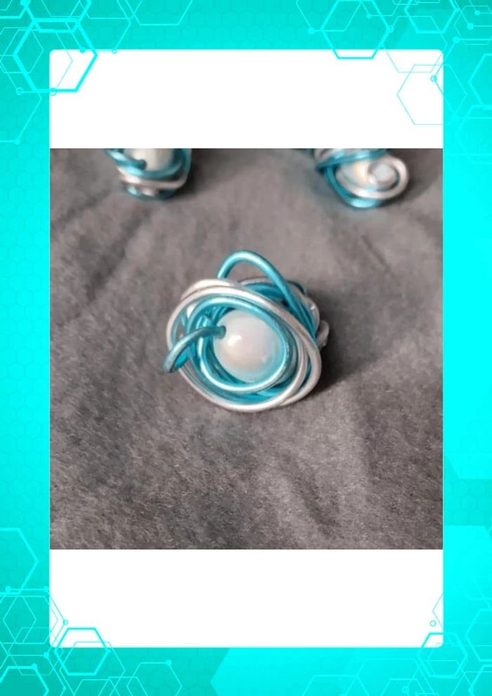 Belle Parure de bijoux comprenant un collier, une bague, un bracelet et des boucles d' oreilles Le collier est tenu avec une cordelette. une perle en nacre au milieu de chaque bijou argenté et turquoise Il est fait main ✋ et c est une pièce unique.