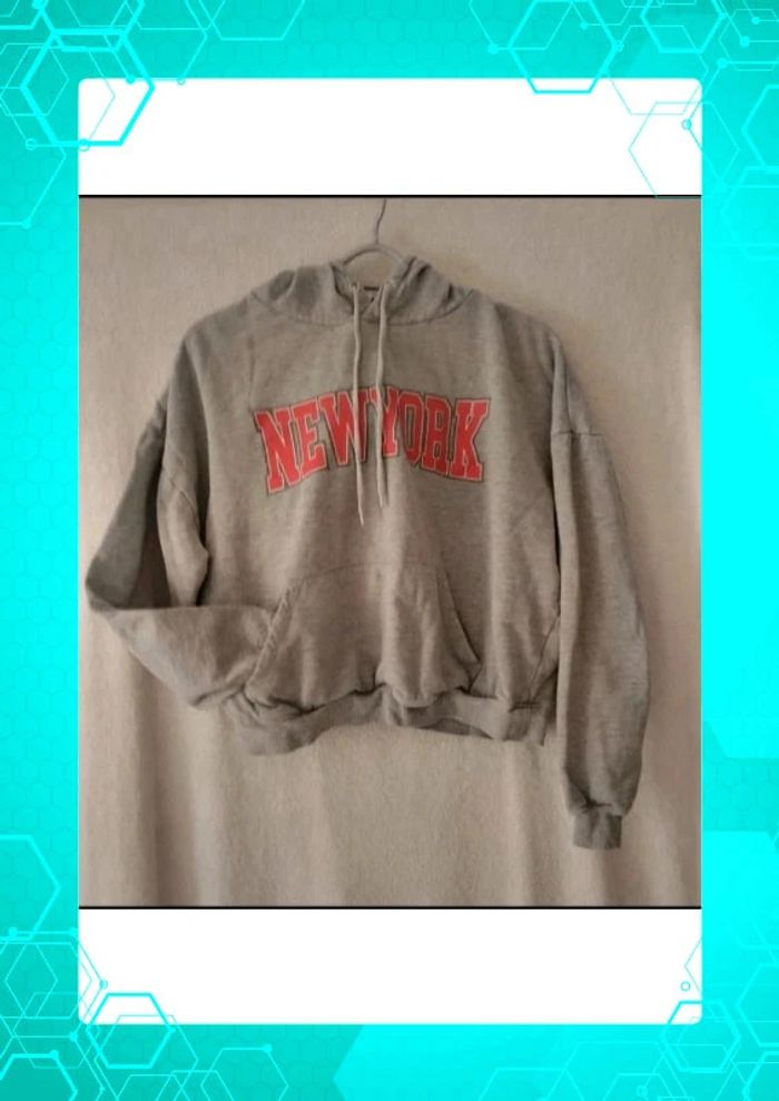 🍂Sweat court à capuche Gris avec New York écrit en rose sur le devant Poche centrale et cordelette au cou. Longueur : 50cm Taille notée : M Marque : Jennyfer Réduction sur les lots activée #T38_laurence8777