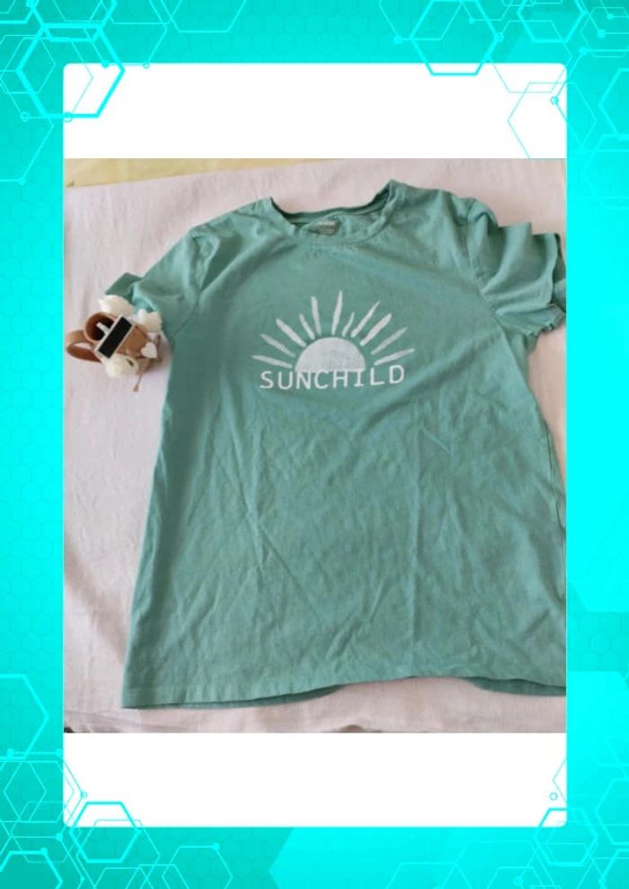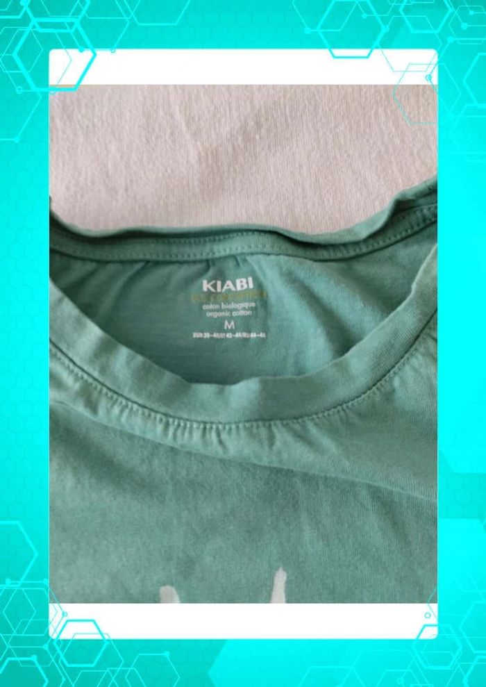 T shirt vert avec motif Eco conception Juste lavé Taille notée : M / 38-40 (taille plus en 40) Marque : Kiabi 📏Mensurations en photos sur un autre t shirt identique rose) 💸Réductions activées sur les lots des 2 articles #T40_laurence8777