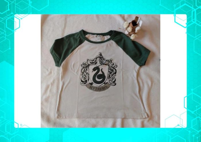 Crop top aux couleurs de Serpentard de Harry Potter. Blanc et vert avec écusson serpent. Taille notée : 3XS Marque : Harry Potter #14ans_laurence8777