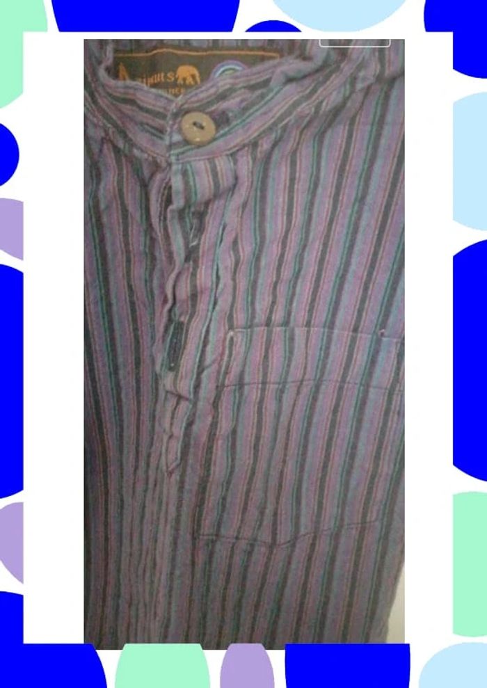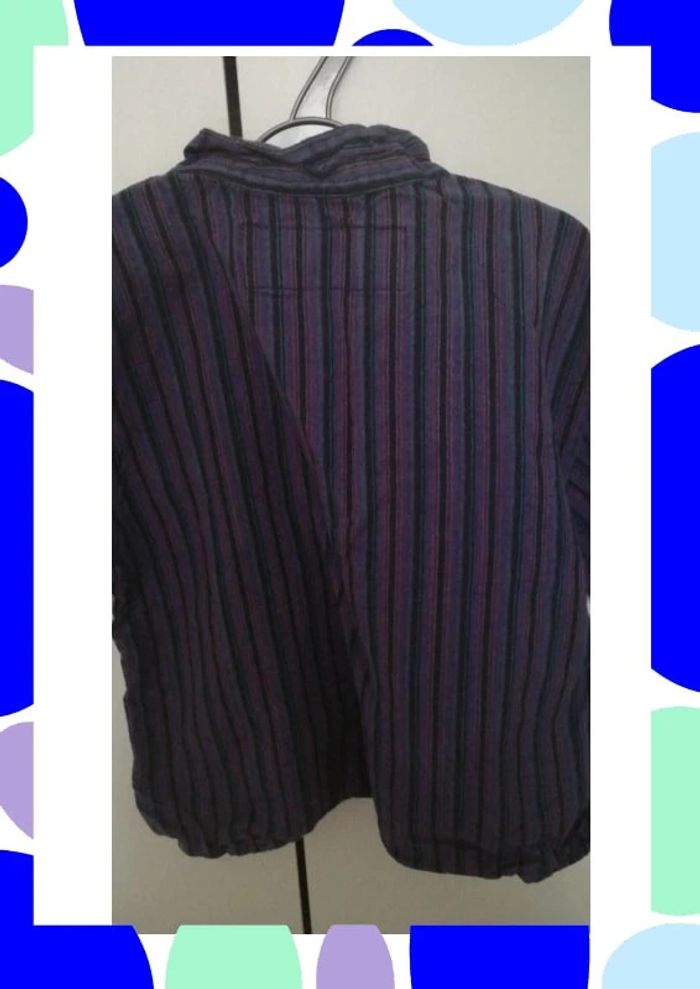 Chemisette col mao Ne s ouvre pas totalement devant (3 boutons) 1 petite poche devant Couleur dominante violet avec rayures noires Boutique indépendante Commerce équitable #4ans_laurence8777