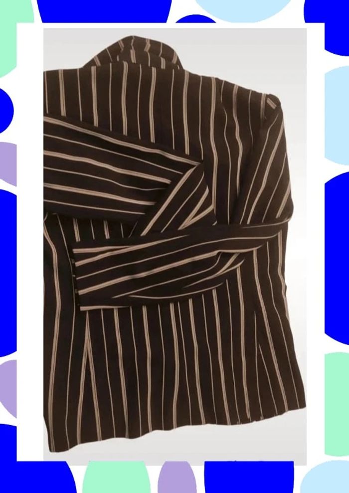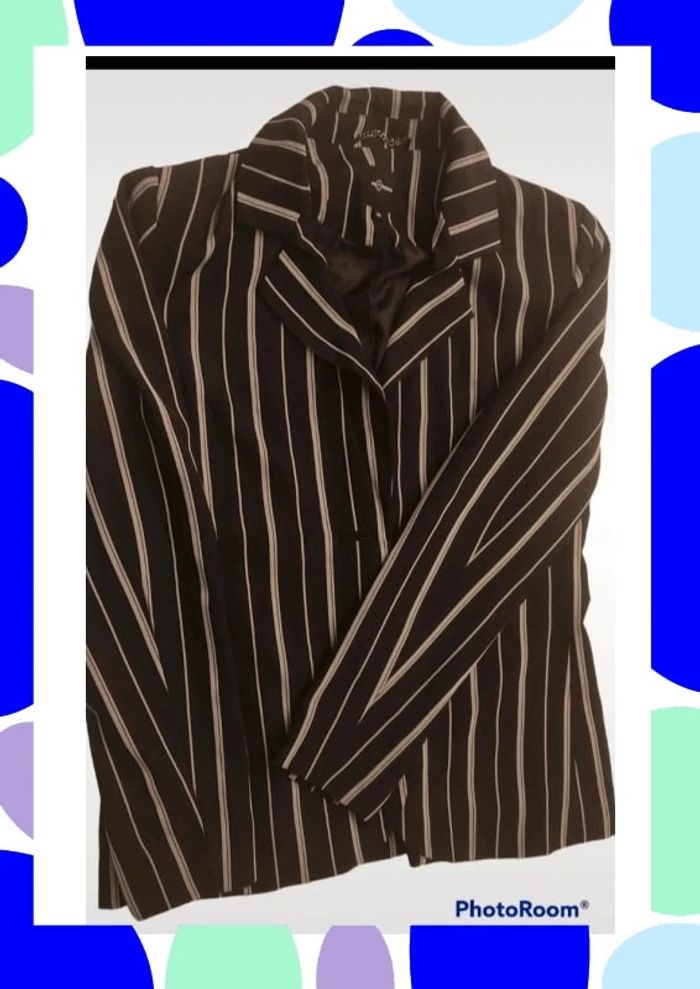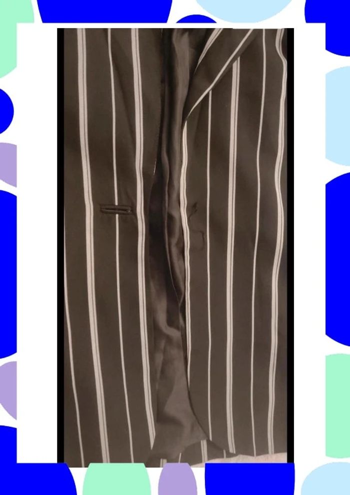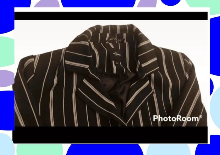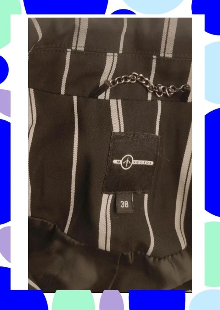 Petite veste rayée de couleur noire claire et blanche Petite chaînette dans la nuque Légèrement ceintrée Il manque le bouton mais les Couturières pourront le remettre aisément Peu portée Taille notée ; 38 Marque : Mosquitos Réductions activées sur les lots #T38_laurence8777