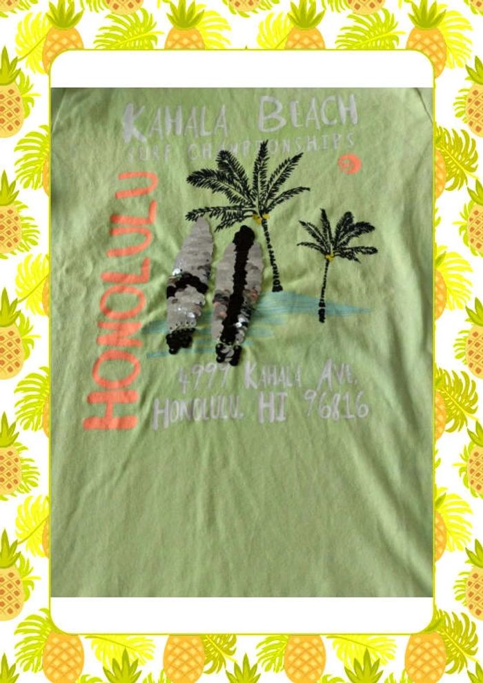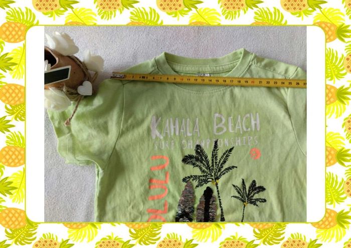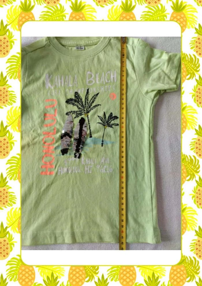 T shirt vert clair motif Hawaii et planches de surf en sequins retournables Jamais porté,juste lavé Mensurations sur les dernières photos Taille notée :98/104 Marque : Zeeman Réduction sur les lots activée #