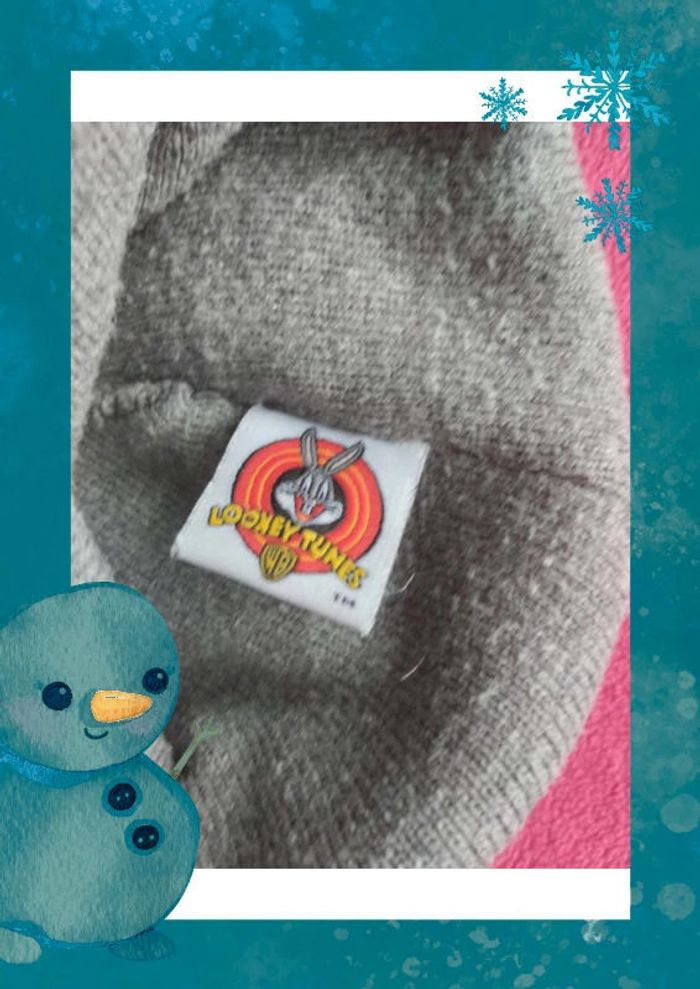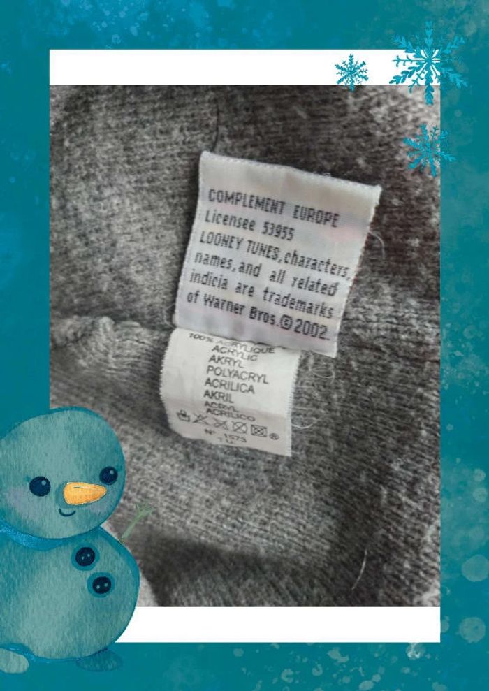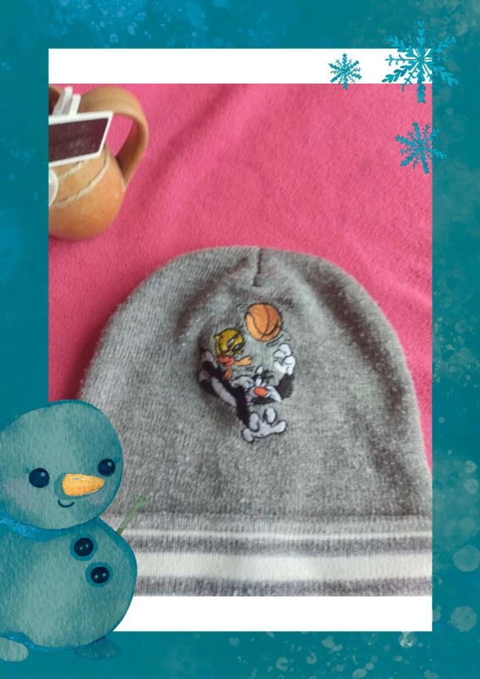 Petit bonnet gris avec Titi et Grosminet en motif Tour en revers rayés gris et blanc. Noté en TU mais peut correspondre à du 5/6ans. #5ans_laurence8777