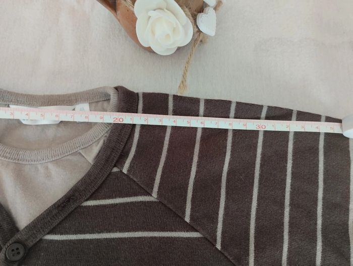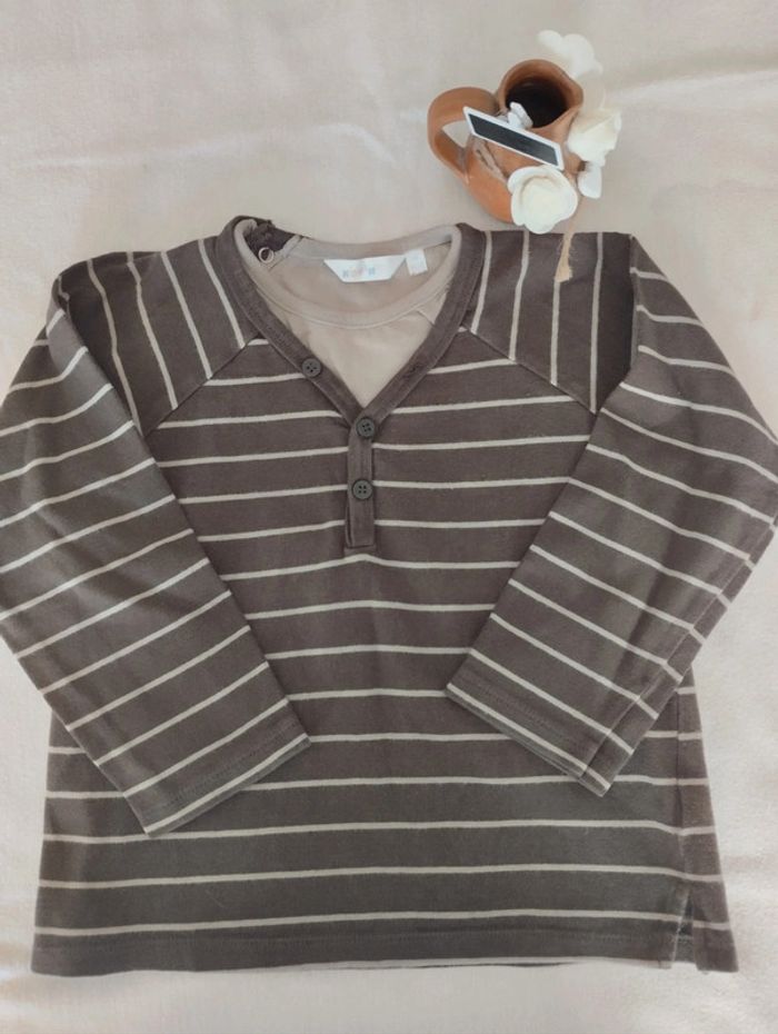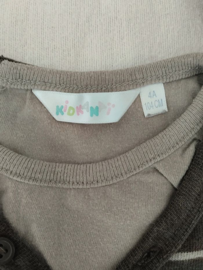 T shirt manches longues marron avec fines lignes beiges Col V et feux t shirt beige. Pressions sur l épaule droite Pas mal porté mais encore en très bon état Il y a encore un bouton de rechange sur l étiquette intérieure Mesures sur les dernières photos Taille notée : 4ans/104cm Marque : kidkanai Réduction sur les lots activée #4ans_laurence8777