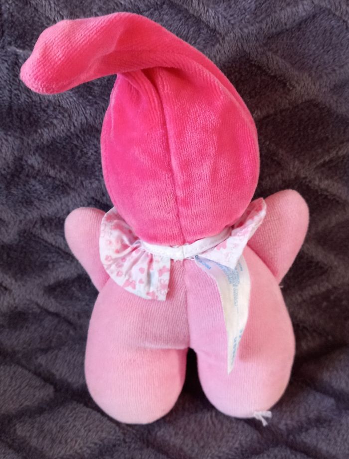Doudou peluche poupée fille en velours de couleur rose Col autour de son cou en tissu de couleur blanc avec motifs cœurs,fleurs et papillons Bonnet sur la tête en velours de couleur rose fushia et sur le devant en tissu de couleur blanc fleuris Bruit de hochet dans la tête