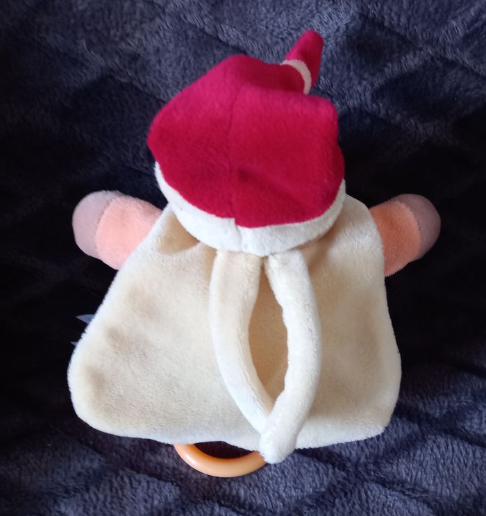Doudou peluche ours mignon en velours de couleurs rouge et saumon Cape Attacher à son cou en velours de couleur jaune Bonnet sur la tête Note de musique brodée sur la peluche Anneau en.plastique à tiré pour déclencher la musique