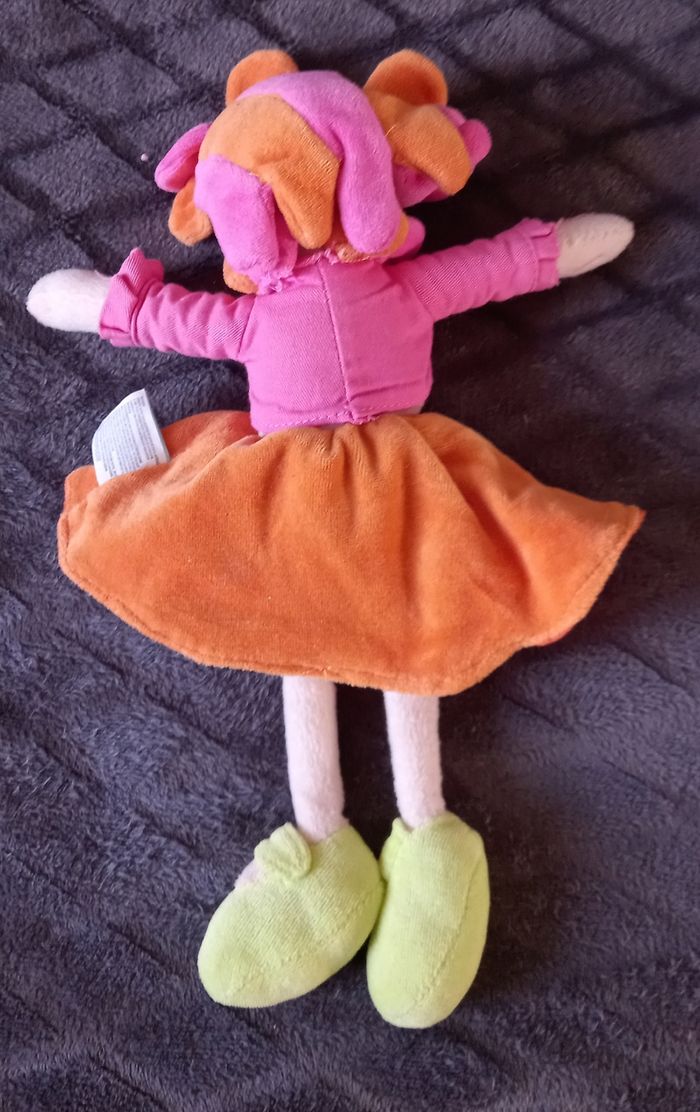 Doudou peluche poupée fille Autour de la tête, pétales en velours de couleurs orange et rose Vêtu d un pull en tissu de couleur rose Une feuille de couleur verte brodée dessus et d une jupe en velours de couleur orange Écriture " Louise " Brodée sur la jupe Soulier au pied en velours de couleur vert