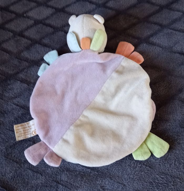 Doudou rond plat panda en velours de couleurs blanc, mauve ,vert orange et bleu et de l autre côté en velours de couleurs mauve et blanc Écriture " Pandy " brodée sur le doudou