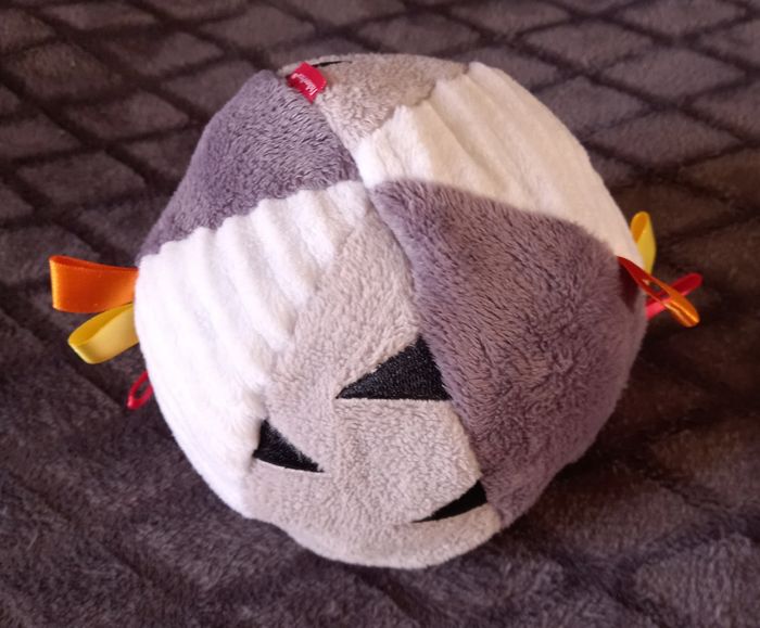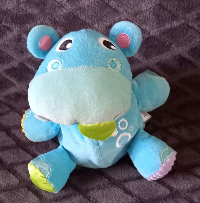 Doudou peluche hippopotame en velours de couleur bleu Retourner l hippopotame pour le transformer en.ballon tout doux avec bruit de papier froissés Étiquettes ruban sur le ballon