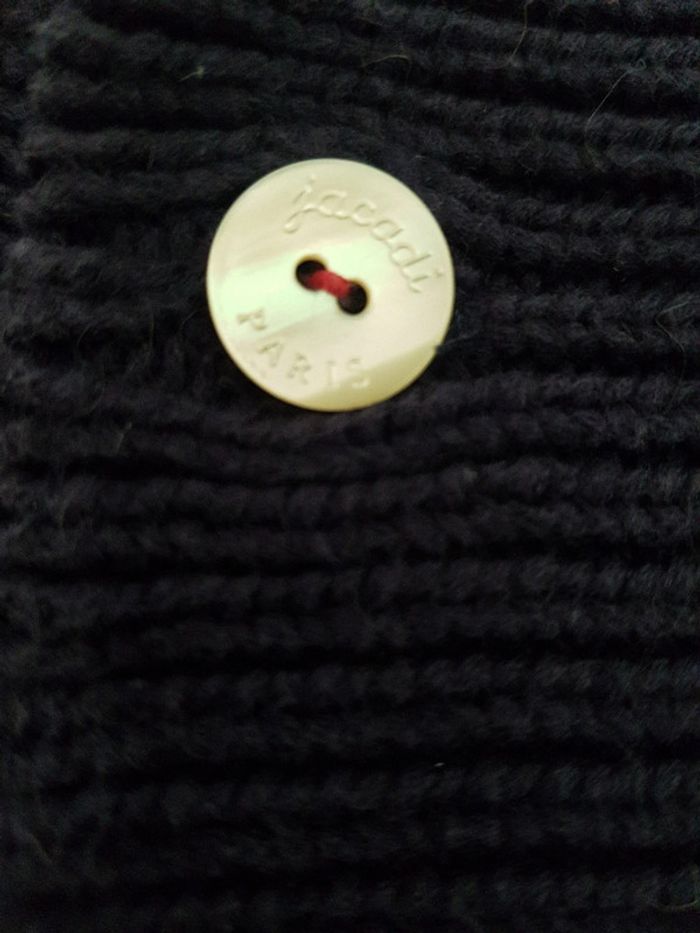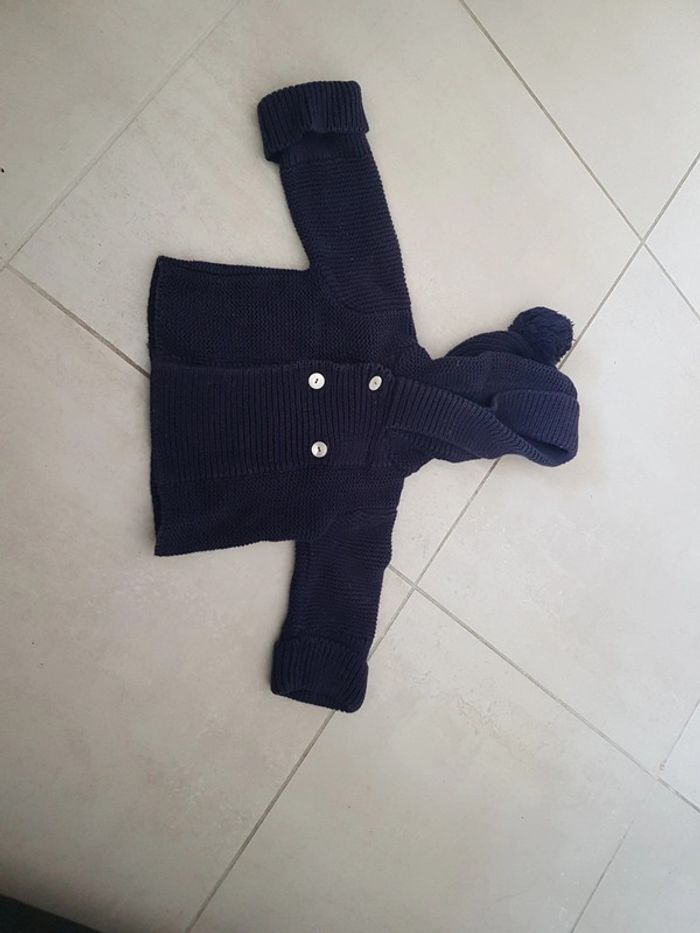 Gilet laine bleu Marine bacardi 6 mois bien chaud manque 1 bouton mais ne gêne pas pour le fermer