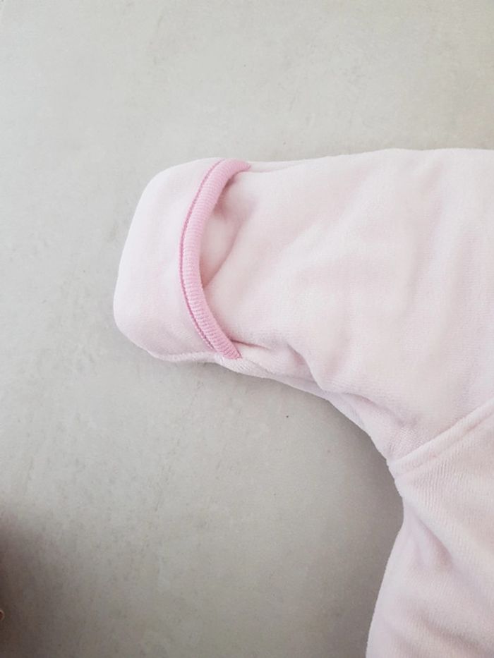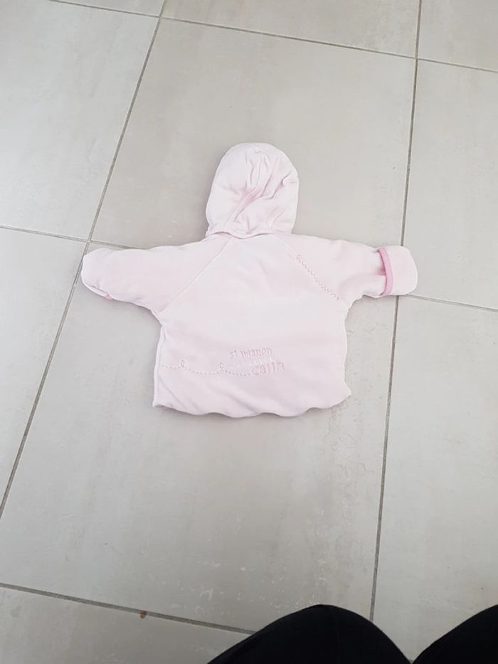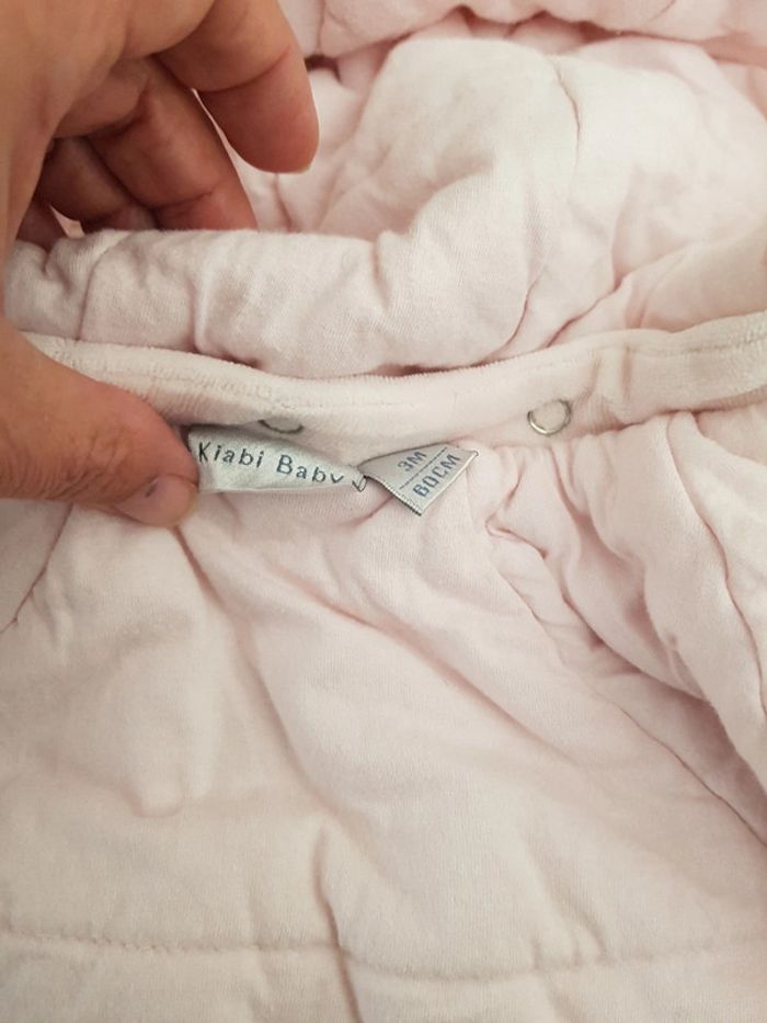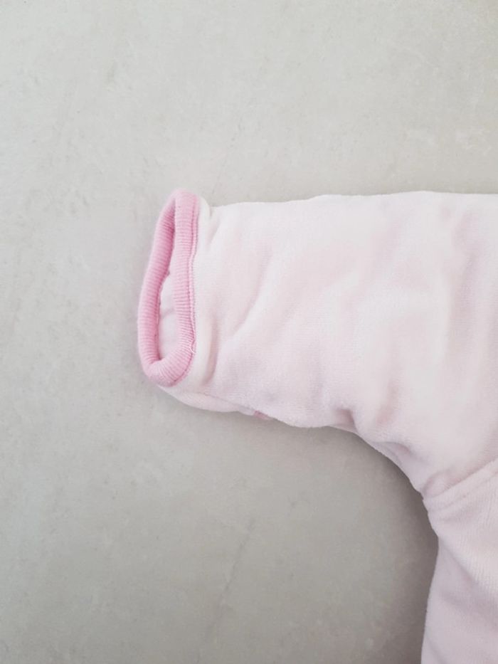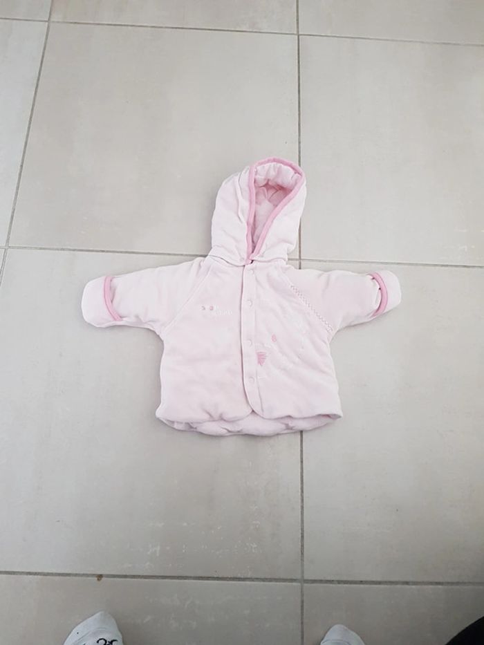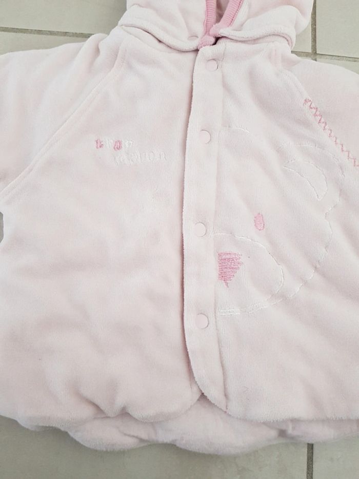 Veste bébé rose pâle bien chaude fermeture avec pressions capuche amovible et fermeture des main comme des moufles si il fait froid voir 2 dernière photos 3 mois 60cm porté 3.4x très bon état