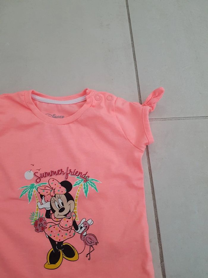 Tee-shirt Minnie orange.rose fluo petit nœud sur épaules Disney Primark 3.6mois neuf sans étiquette juste lavé pas la bonne saison pour ma fille #bébé #disney #minnie #primark #6mois #3mois